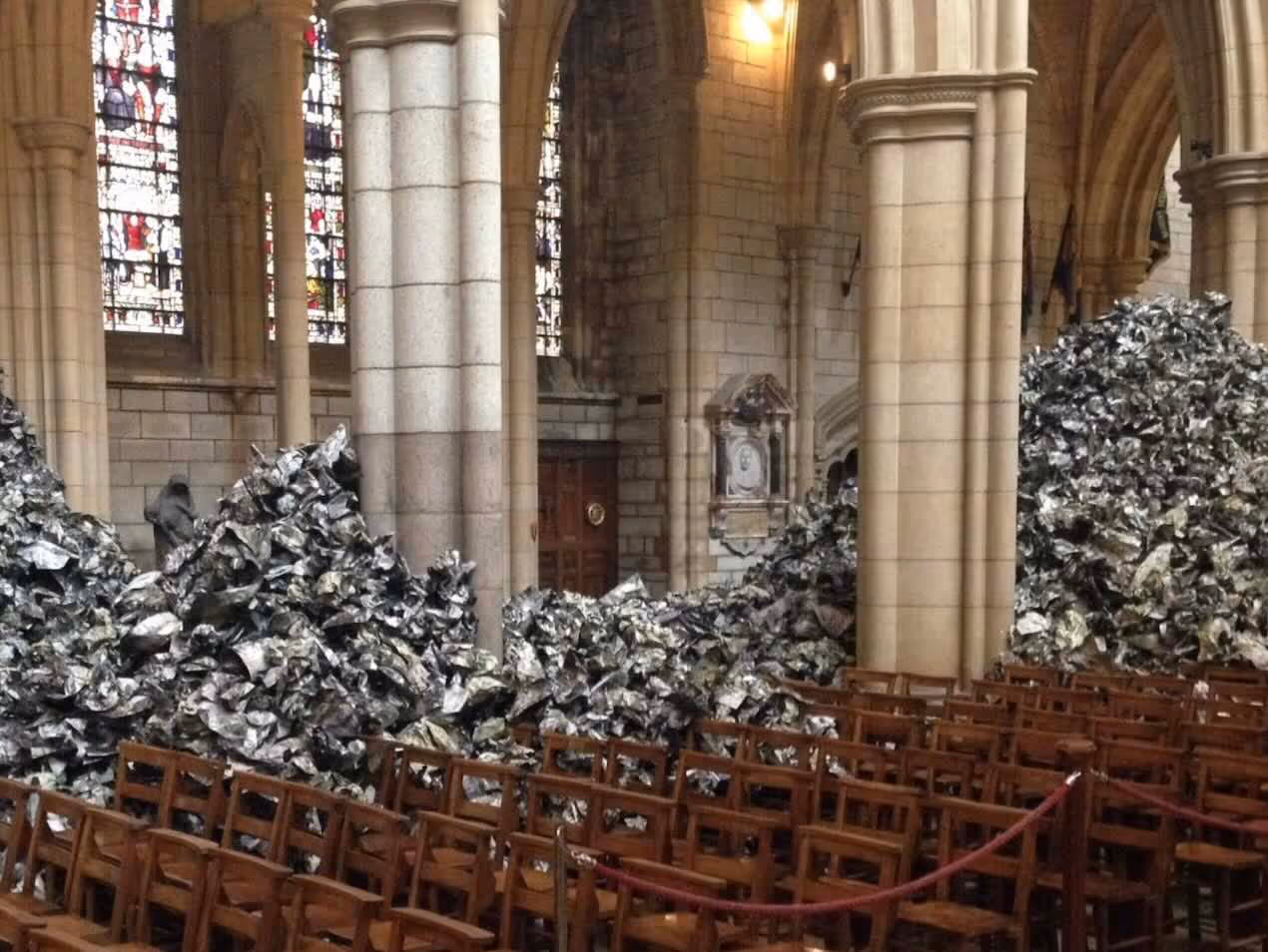 The vast work occupied much of the south aisle, spilling over rows of pews in the nave of the Cathedral. The work was constructed from 30,000 A1 crumpled, printed sheets carrying images devised by Qureshi and was installed by a team of ten, working over four days under his guidance and in full public gaze.