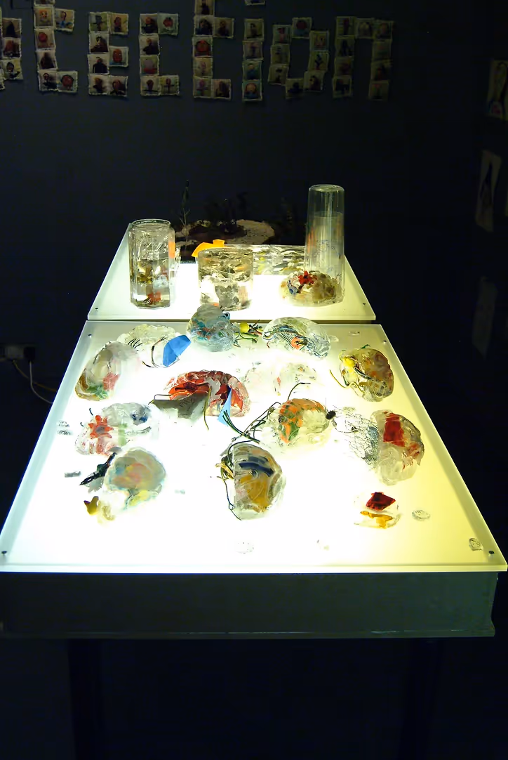 In 2005, the Shrinking Childhoods exhibition was composed of the works of over 1000 children, aged between four and twenty, who attended a number of workshops over the summer, organised by Kids Company, in collaboration with Tate Modern. The work they produced was exhibited in various Portocabins situated on the South Lawn, in front of Tate Modern. The creations displayed aimed to express the experiences and everyday struggles of these children, coming from a background of violence and poverty. The rooms inside the Portocabins included the hellish recreation of a crack house, with an unmade bed and an ignored child in the corner, as well as tables filled with 'brains', made out of resin and plastic. These brains showed the children's deepest fears left in their heads after years and years of abuse, from a black scorpion and a gun with the word 'kill' on it to severed wires labelled 'love'. Shrinking Childhoods was an exhibit simultaneously filled with hope and despair.