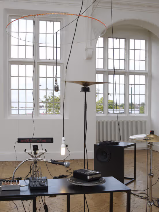 Using an eclectic range of objects and elements including used furniture, outdated electric appliances, electronic materials, light and the appropriated work of other artists, Mirza creates complex audio installations which investigate the moment where noise becomes music. For his new installation made for Camden Arts Centre, Mirza brought together a number of instruments traditionally associated with bands including a keyboard, drum kit and synthesisers fused with turntables, LED lighting, lamps and radios in order to create a minimal audio composition. In Mirza’s assemblages each element plays a specific part; objects affect each other and are reconfigured in different ways.