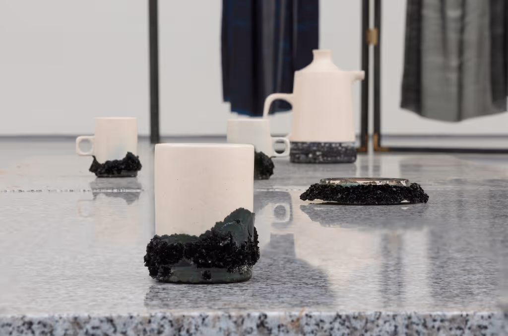 Certain compositions in the gallery also hinted at or made use of photographic processes. Macintyre grew crystals from the same chemistry used in the cyanotype paper coating process: some of these structures were grown during a summer heatwave and had a dense, spiky appearance whereas others grown during colder months were softer and less structurally developed. Here, she was interested in the overlap between substance and time – how an artwork can form a record of the conditions under which it was made.