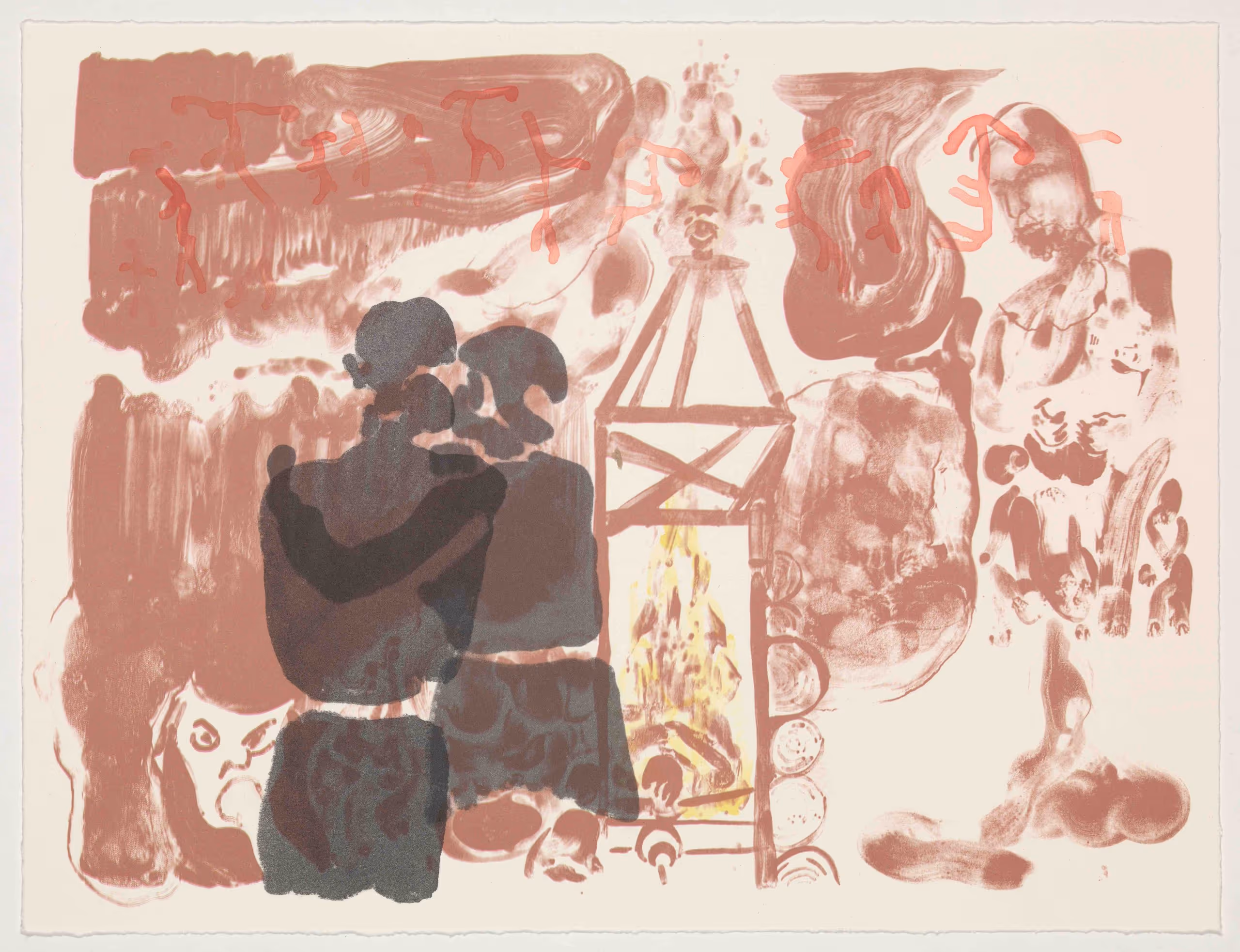 Ngaben is a Hindu cremation ceremony practised in Bali, and central to this intimate cycle-of-life vignette is the burning pyre. Two women hold each other as they watch the flames, while to their right a mother breastfeeds her baby. Mischievous mask-like faces crowd the bottom of the image, and a line of simplified figures from early south-east African paintings form a mysterious script across the upper edge. Best known for his oil paintings on Lubugo bark cloth, used by the Baganda people in Uganda to make burial shrouds, Armitage merges European painting styles with east African subjects and materials, or experiences of his recent move to Bali, weaving narratives drawn from historical and current news media, popular culture and his own memories and imaginings. Often, as here, the real meets the ethereal. In marking the friendship of artists across generations, Armitage was inspired by a vital outcome of the Robson Orr TenTen Award. Every year, sales of 11 of the limited-edition prints fund the acquisition of work by emerging British artists and those currently under-represented in the Collection.