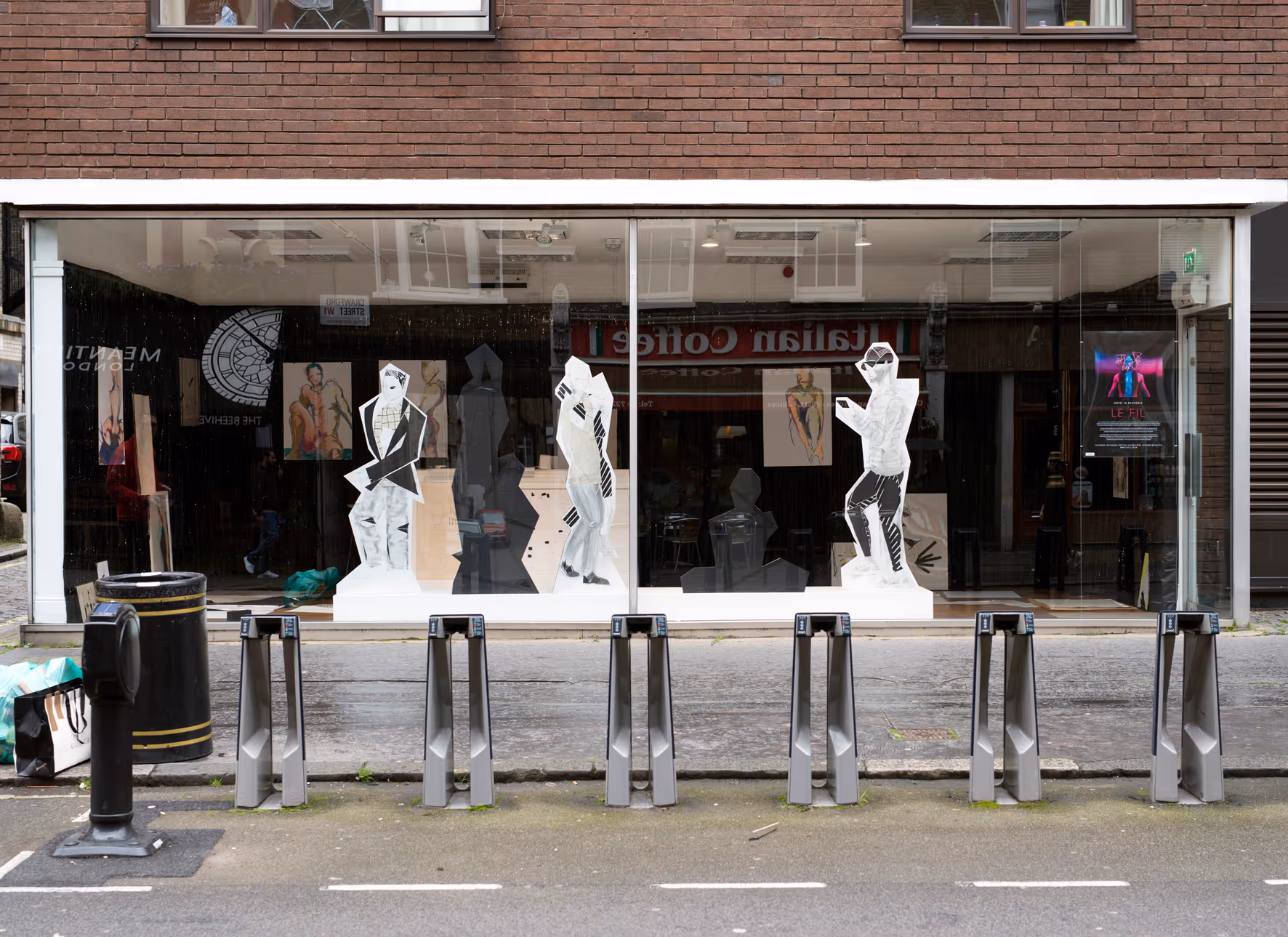 In this Outset studio residency, passers-by could watch Le Fil work through the giant windows of the part-studio, part-exhibition space as he blurred the lines between public performance and private process. Using this concept of revealing the hidden to underpin the work, he has created an evolving installation of drawings with explorations of the sculptural body through collage, monoprint and conversation. The revealing artworks featured naked male figures, cheeky voyeurism and a central window installation that combined public faces with private silhouettes as it re-imagined the secret lives of the window’s passerby’s. With these studies, Le Fil examined how we shape our private selves for public consumption.
