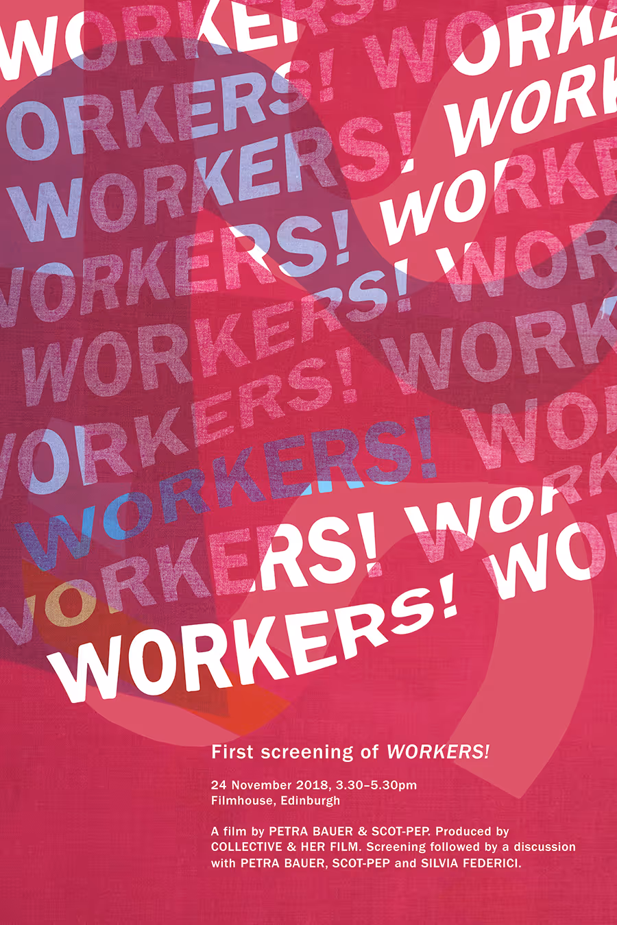 Workers! premiered at Edinburgh's Filmhouse cinema in November 2018, followed by a panel discussion with Bauer, members of SCOT-PEP, and Federici, chaired by Collective’s Producer Frances Stacey. In advance of the premiere, Federici presented a public lecture to over 500 people at the University of Edinburgh, as a primer for the film screening. The lecture, co-presented with Talbot Rice Gallery, addressed interpersonal and institutional violence against women as discussed in Federici’s new book Witches, Witch-Hunting, and Women, which offers powerful tools for understanding collective resistance to victimisation in the past and today.