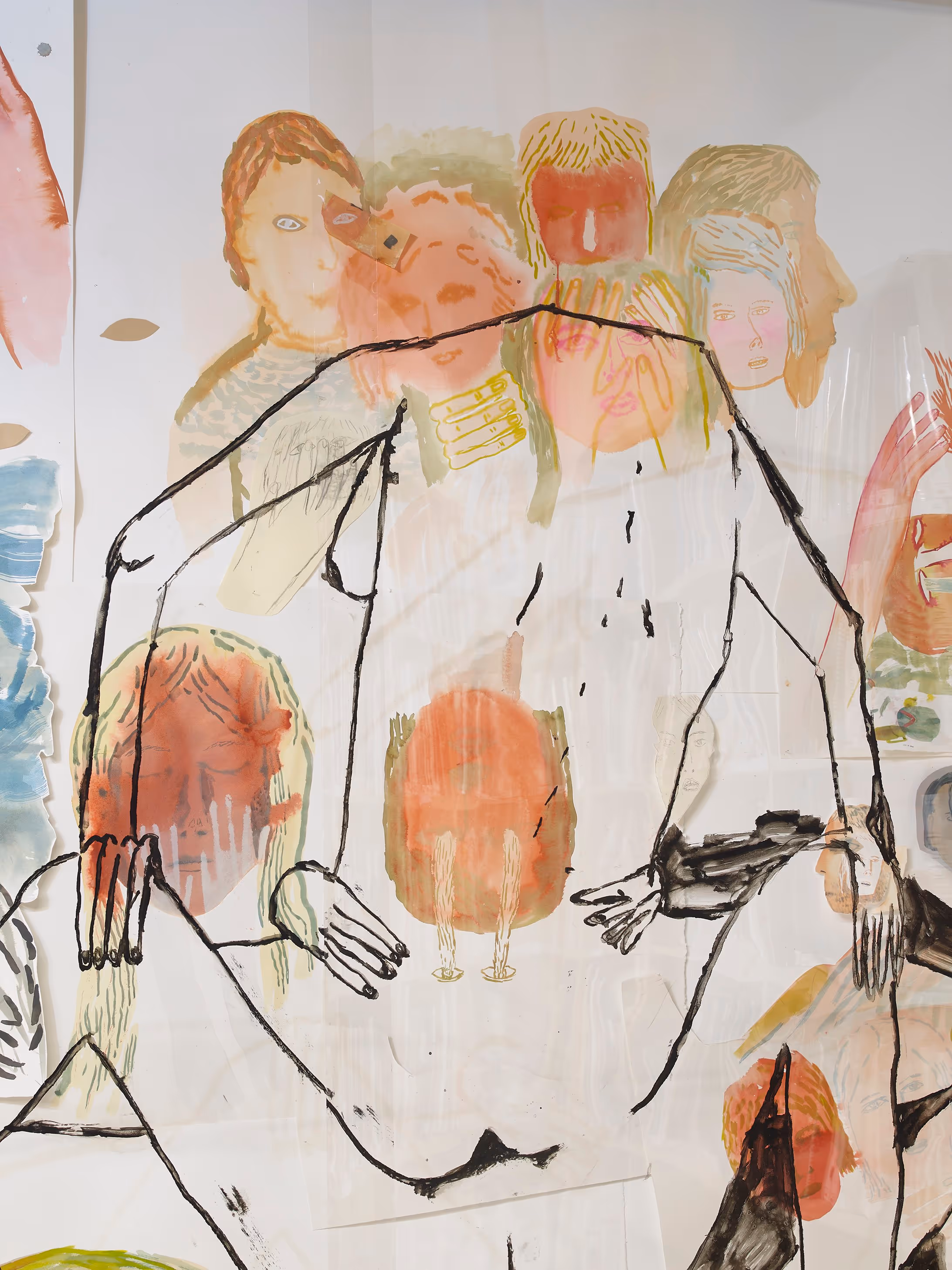The Annotations 5 commission, by London-based artist Devlin Shea, explored her experience of spending time with books in Outset Study. The artist has selected materials that imbue the work with the sensation of handling books and leafing through them: ‘I wanted the materials to feel tactile, similar to picking up a book and the level of intimacy that can unfold’. The scale and materials employed in Getting Closer were also influenced by the formative experience of cinema for the artist. The drawing was made on acetate which floats in the space. Light reflected off this plastic screen and visible through the transparent veil were a range of smaller scale works of disembodied heads, made with ink on paper. The multi-layered quality of the installation reflected the artist’s interest in the complexity of human relationships.
