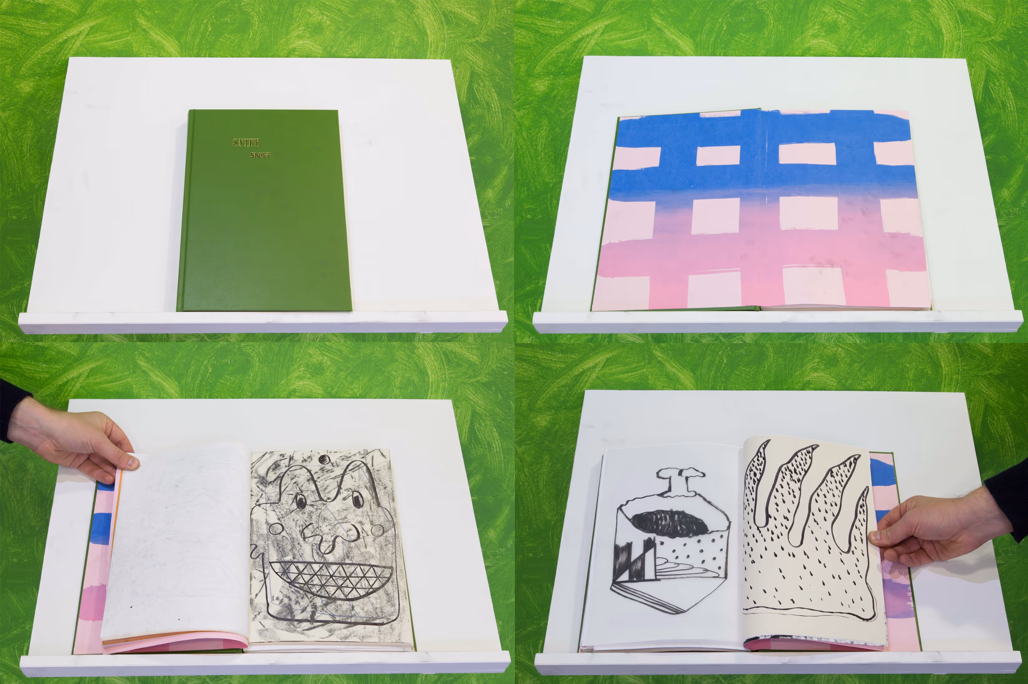 The works made for this Annotations commission were directly informed by Shield’s research within Outset Study. Shield responded to Philip Guston’s politically charged 1960s Nixon cartoons, in which the same exaggerated character is repeated across multiple drawings and narratives to expose the political landscape of the day. Also to Nancy Spero’s sequential and totemic collages, which seem to project a sinister world, with figures suckling at a helicopter-fly hybrid and fleeing bodies that are positioned as if trying to escape the pictorial bounds of the image. Shield was also drawn to a collection of Raymond Pettibon’s early comics, which he found to be embedded with a stark sense of existential fear, together with Pettibon’s technique of framing narrative through the use of structurally prohibitive modes of image-making such as bars, grids and restricted apertures.