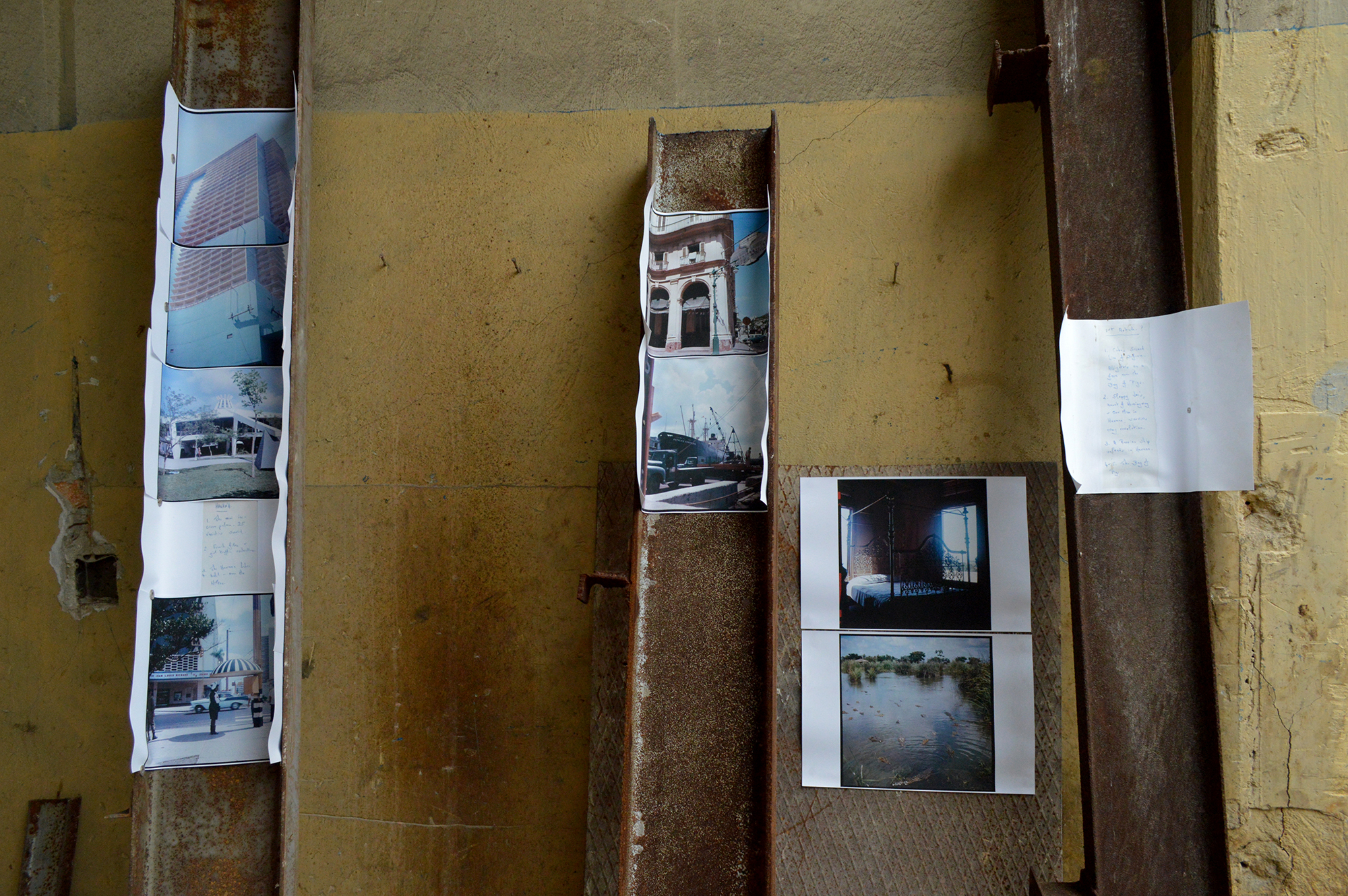In 'Looking Through The Telescope from the Other End', Richard Wentworth deploys historic images of Cuba, its geographies, characters and moments, sourced from negatives and notes taken by Graham Greene in Cuba in 1966. Physical elements that narrate a particular visuality are transported and relocated to an urban ruin, a former bicycle factory in Havana, where they combine with other fragments that witness the exploration and fixed gaze from ‘the telescope from the other end’. The artist explains: ‘Setting out the prints made from the Graham Greene scans, I could see how well they would perform in context, a bit like those films where a dead relative walks back into a family gathering… The audio/visual aspect of the audience was very moving, seeing people peering into the past and sharing perceptions with their neighbour and then arguing about different locales...’