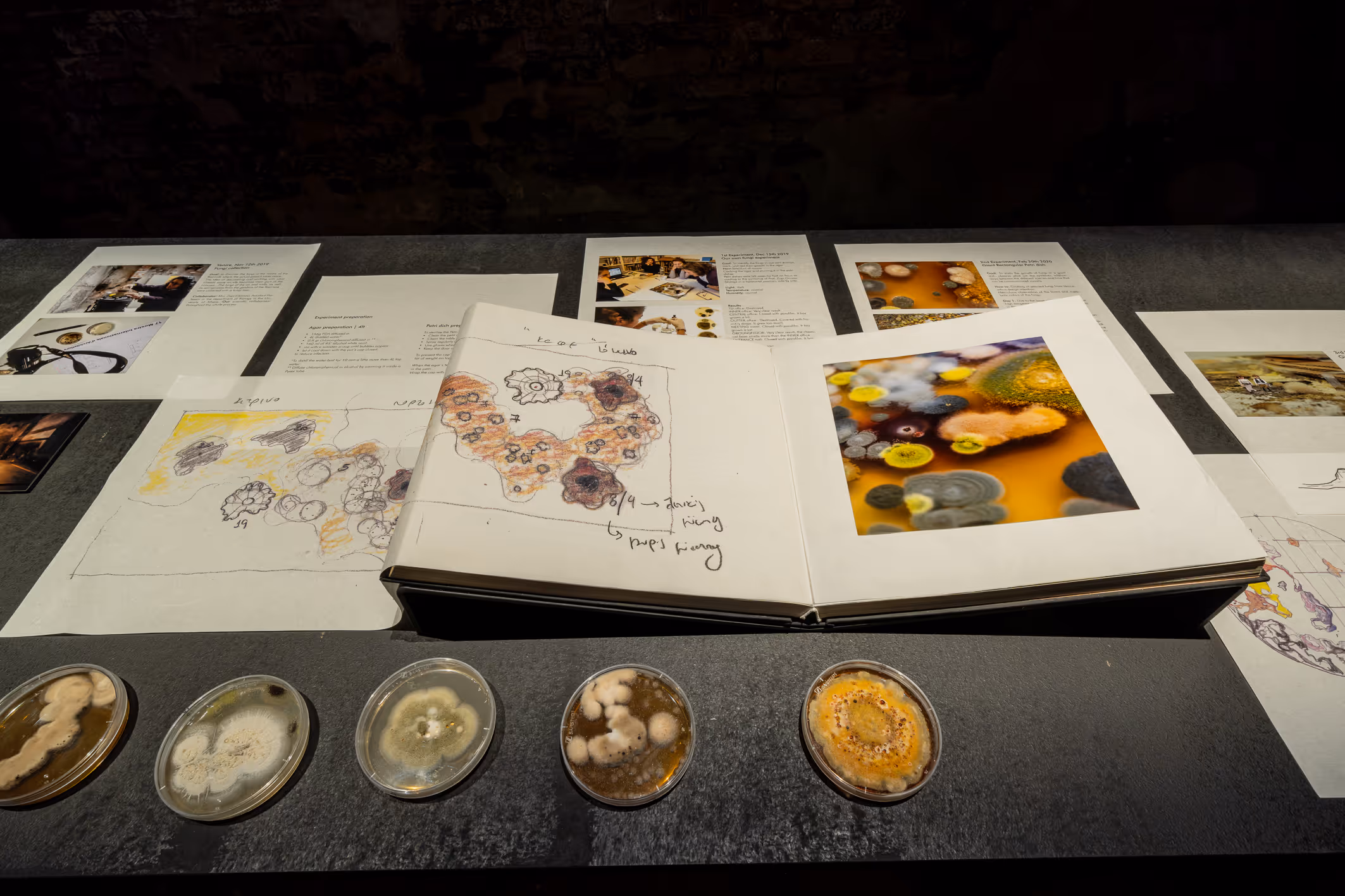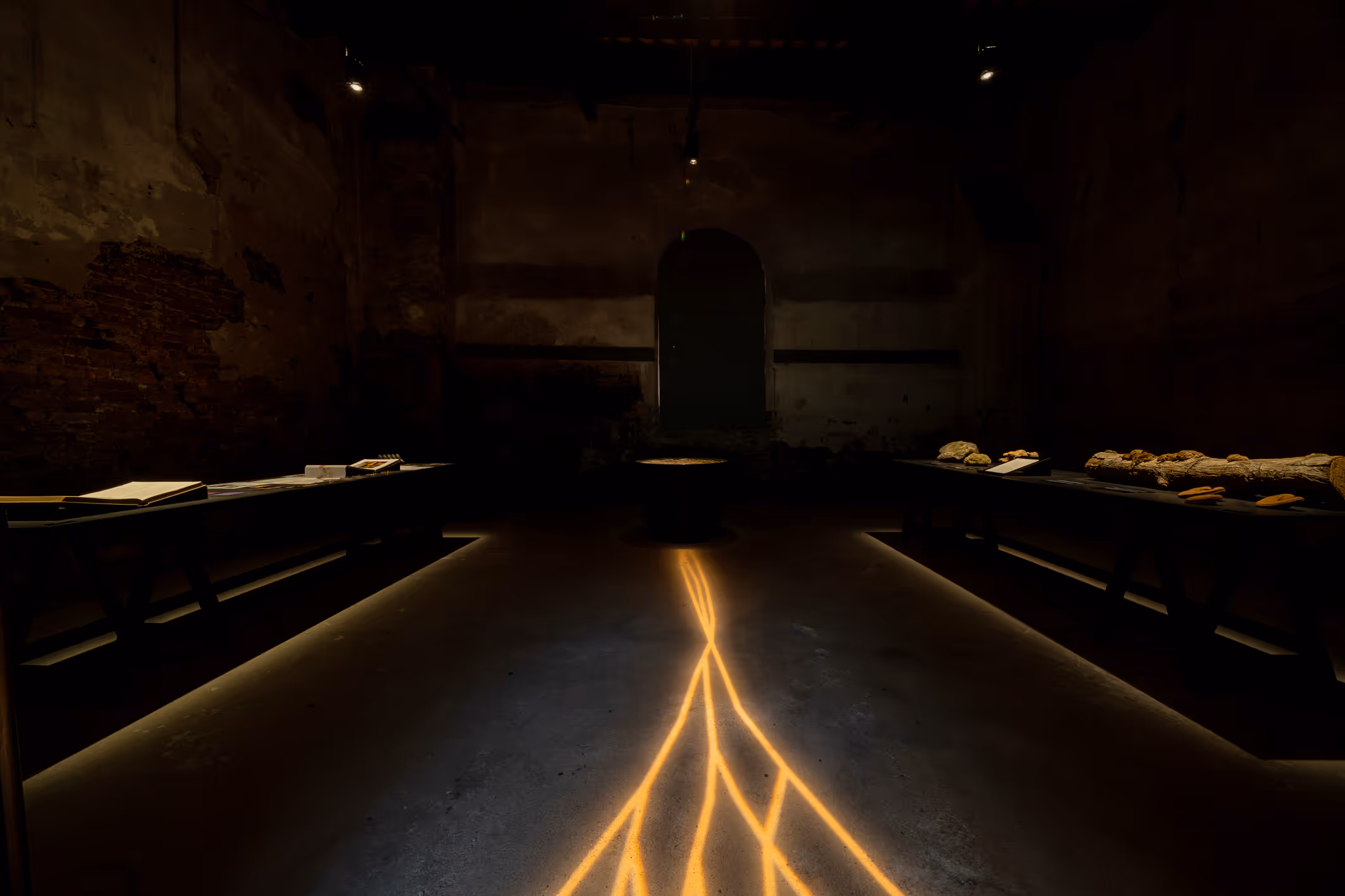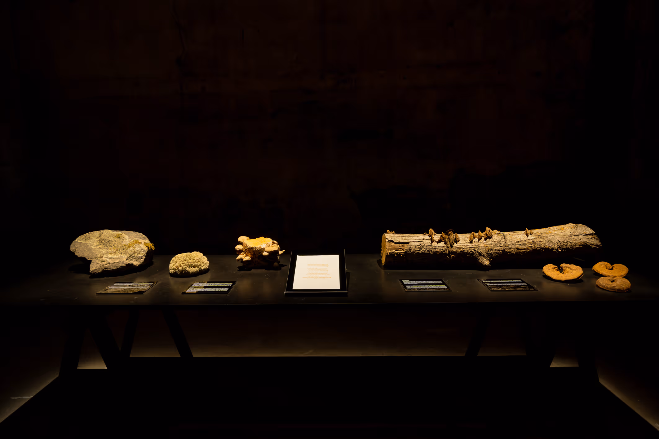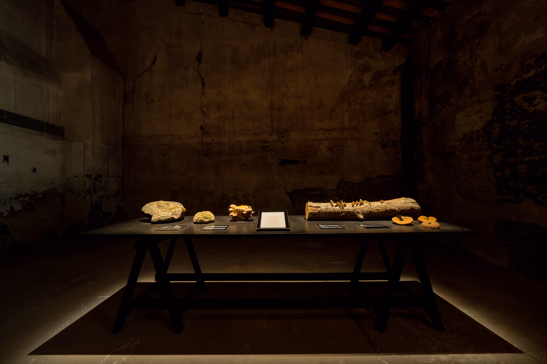How will we live together on this multispecies planet? By understanding, respecting, and connecting to the web of entanglement that is life on Earth. An unsung hero of this web is the kingdom between plants and animals, that of the fungi. Creators and facilitators of life, fungi are as resilient as rock and can turn rock into soil through edafogenesis. They form mycelium networks making extraordinary sentient connections among trees. They are recyclers, metabolizing the decomposing organic matter, returning it to the biological circle. Without them life on Earth cannot exist. Entangled Kingdoms presented fungi spores collected from the two rooms of the Arsenale cultivated in the mycology department at University of Athens. At the Biennale, these returned as a "fungi garden" in a two-part installation. Having first placed humanity in the wider context of the plant, animal and fungi kingdoms, this project invited reverent reflection upon the complexity, beauty, and also invisibility and ubiquity of fungi in the world around us.