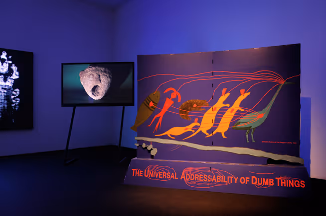 Through his videos and performance lectures,Mark Leckeyhas established himself as a cultural anthropologist whose dissections of digital media and contemporary consumerism speak to the myriad ways in which technology has altered our relation to the world. For the 55th Venice Biennale, Leckey has created a video using three-dimensional scans of an exhibition he curated at the Bluecoat in Liverpool, entitledThe Universal Addressability of Dumb Things. Serving as the show’s enhanced digital doppelgänger, the video presents artworks by Leckey and a cast of others alongside the panoply of historical and contemporary artifacts that Leckey brought together in order to propose a coming era of ‘techno-animism’. In this future, technology will have so thoroughly transformed our relationship to the objects around us that the line between the animate and the inanimate will have blurred. However, while the staid and static objects in the exhibition merely hint at this coming upheaval, his video brings the show’s concept to dull bloom, as objects are animated out of their torpor and allowed to take on gregarious, uncanny lives of their own.