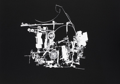 This work is part of a series of drawings, made with correction fluid, based on photographic records of a performance by the Swiss artist Jean Tinguely (1925– 1991). The performance, Homage to New York, was staged in 1960 in the garden of MOMA, New York. Tinguely’s construction self-destructed as part of the performance, and now exists only through some fragments and photographic records. Having first encountered Tinguely’s work at the Tate retrospective in 1982 while still a student, Michael Landy has been intrigued by his work for many years, and investigated the possibility of re-staging the Homage to New York event.