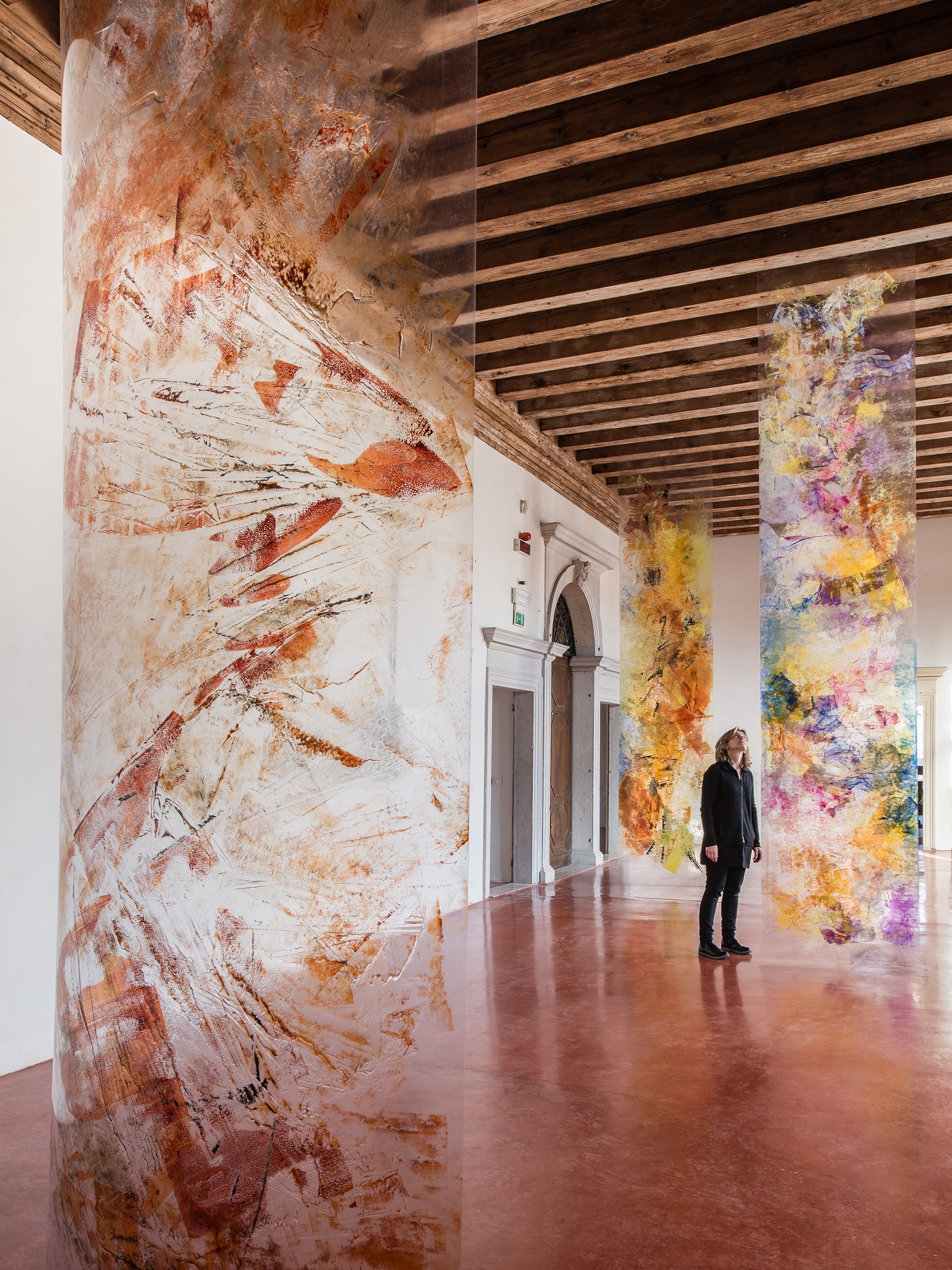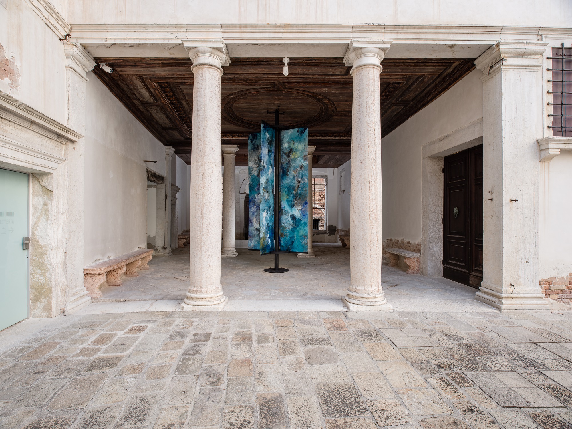Entering into a close dialogue with the premise itself and its rich history, the works related powerfully to the unique architecture and period furnishings of the palazzo, touching as well on the important collection of art and archeology it houses. In their vibrancy, color and magnitude, Barkat’s works echoed and accompanied the rich visual scheme of the decorations and wall paintings, which celebrate the Grimani family and the Venetian Republic at large.