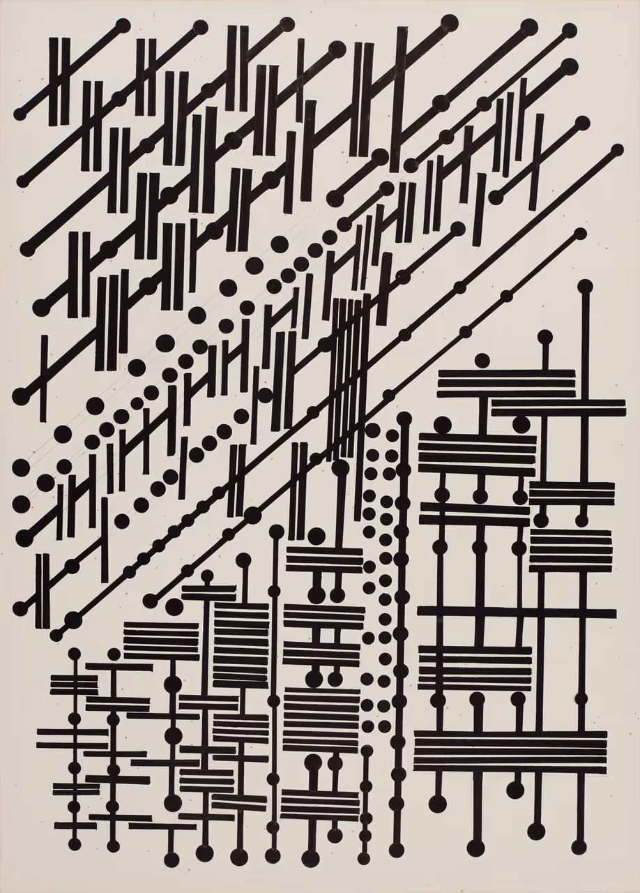 Several of her works on paper produced between 1975-1978 depict circuit boards, though without any intention to create an applicable model. The form of her precise free-hand design is imbued with expressive qualities, echoing musical notations.