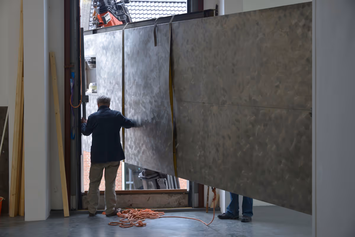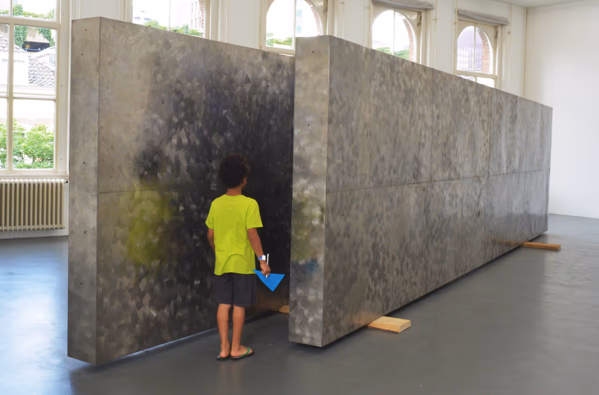 For the exhibition 'The Part In The Story' Bik Van der Pol decided to bring the sculpture 'Two Rectangles Vertical Gyrating' (1971) by George Rickey, and install it laying down on the floor of the exhibition space. This kinetic sculpture, normally installed on Rotterdam’s busy Binnenwegplein, has somewhat of a contested history. After recent renovations of the square causing an elevation of the ground, the blades of the sculpture rotate at a mere 2.11 meters above street level. The sculpture was hence considered a safety hazard because of the danger of it hitting the heads of passers-by. In prevention of any accidents, the sculpture was fenced off in 2012 and temporarily removed later that same year. Since then Sculpture International Rotterdam (SIR), to whose collection the sculpture belongs, and the Public Works Department have attempted to find a solution in close conversation with the estate of the artist, who had passed away in 2002.