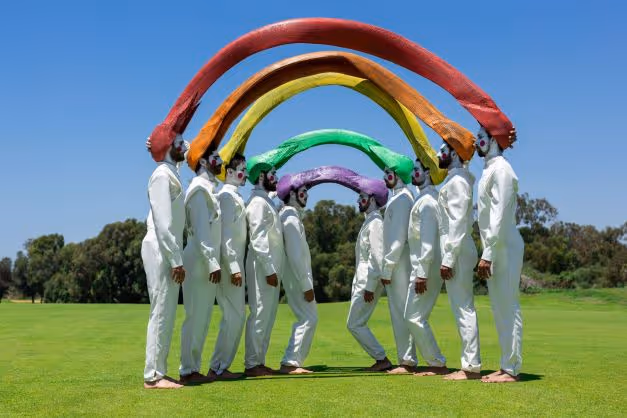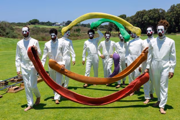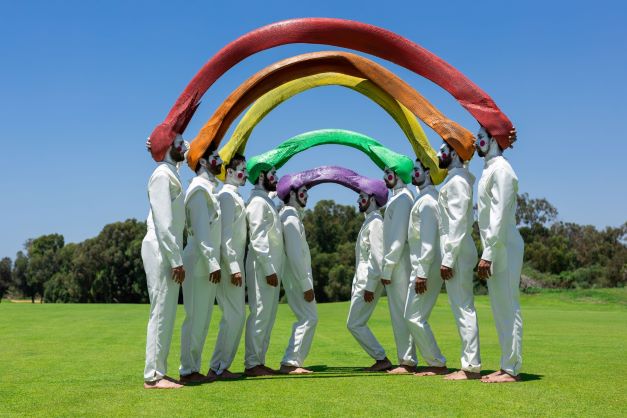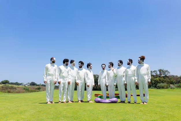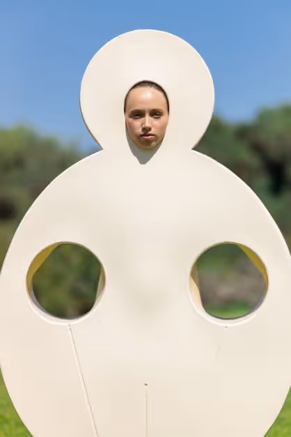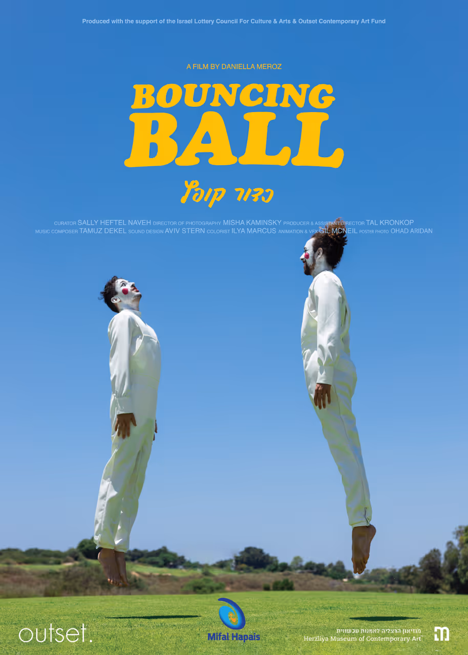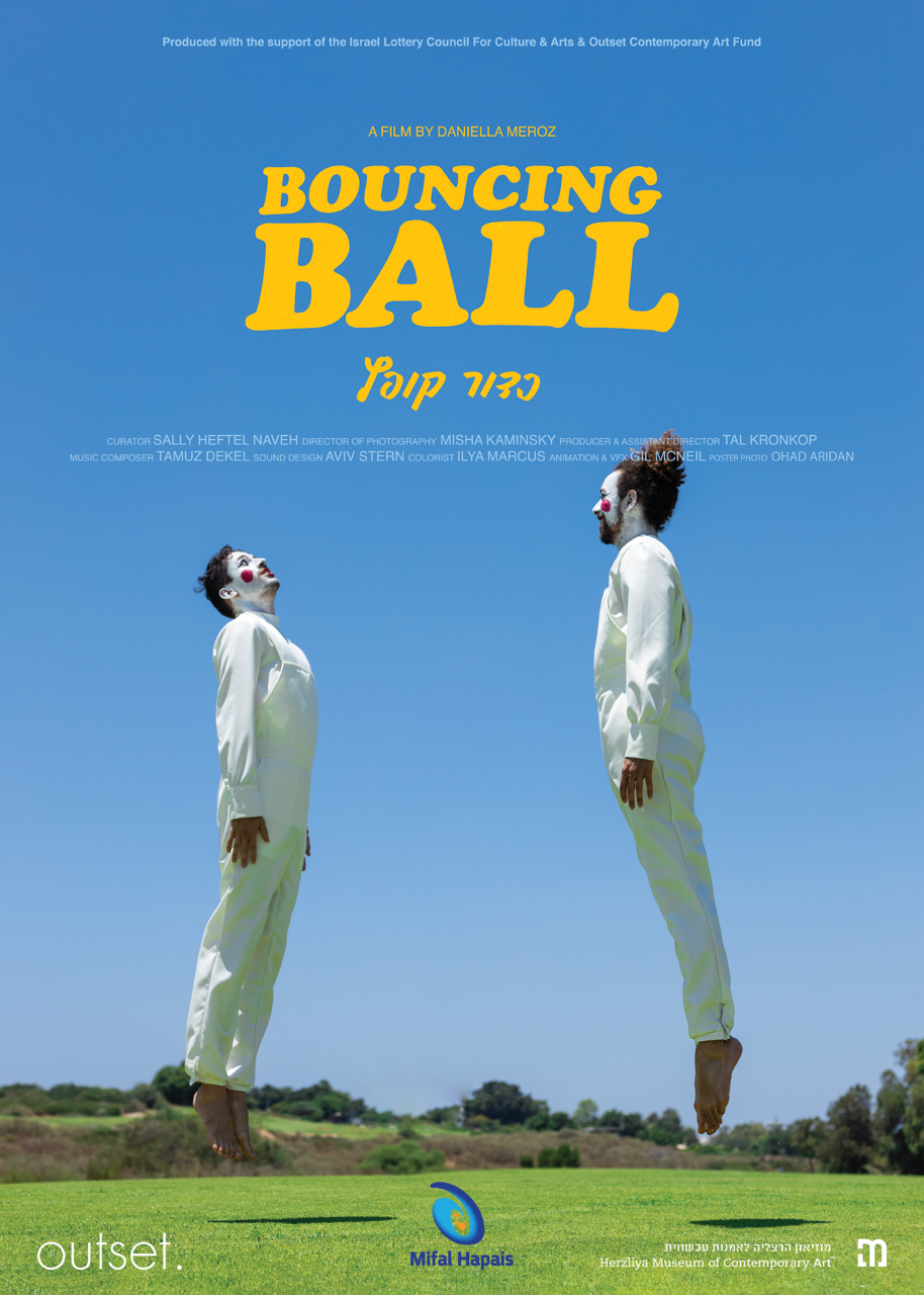 The work Bouncing Ball draws inspiration from many visual and textual sources, from the classical era to contemporary popular culture: depictions, mythologies, figures from the repertoire of commedia dell’arte and the Bauhaus theatre, folk dance movements and gestures, and so forth. Meroz interweaves in her work principles from theological doctrines and political ideologies of totalitarian regimes, to create a world of fantasy that operates according to an internal logic. The video suggests a disillusionment and disappointment with ideologies of the past and presents a naïve childlike aesthetic that masks the reality of a brutal struggle for survival. Echoing the collapse of the utopian dream, it casts doubts on the feasibility of the existence of a humanist society that upholds values of equality and peace.