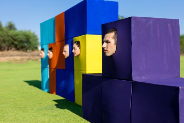 The video work Bouncing Ball shows a polarized world forged by just two actions – hitting the ball and escaping from it. On manicured lawns, a row of figures are seen being subjected to relentless attack from a single game ball, or running from it. The ball offers the central viewpoint of the work and is its plot generator. The video presents an imaginary world populated by characters that are fantastic, colourful, and humorous but also vulnerable. Their role is defined by their shape, attire, and attributes. Their limitations and narrow worldview, too, serve their destiny in the world. As in mythological plots or in superhero depictions, the imprint and characterization of the figures are deterministic, depending on their intended role in the great scheme of things.
