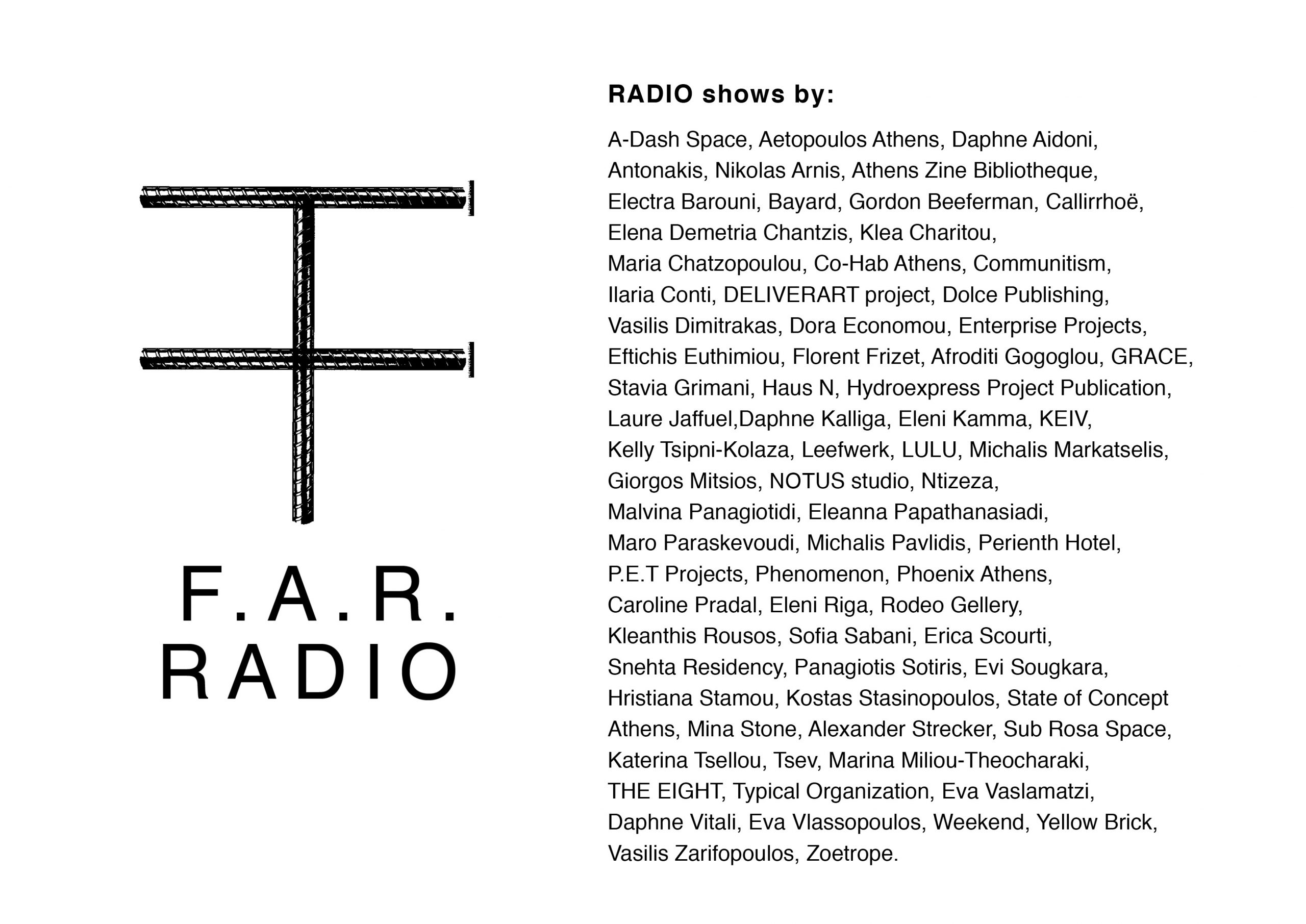 On December 8th, the program began with F.A.R. RADIO, a temporary web radio station, broadcasting at 3137.gr/far-radio-player/. Invited guests of F.A.R. RADIO were art initiatives of the city, individuals with a research interest in housing and collective/individual property and employees or owners of small businesses in the Exarcheia neighbourhood. Project spaces, art initiatives and art professionals developed radio shows, featuring sounds, music and discussion.