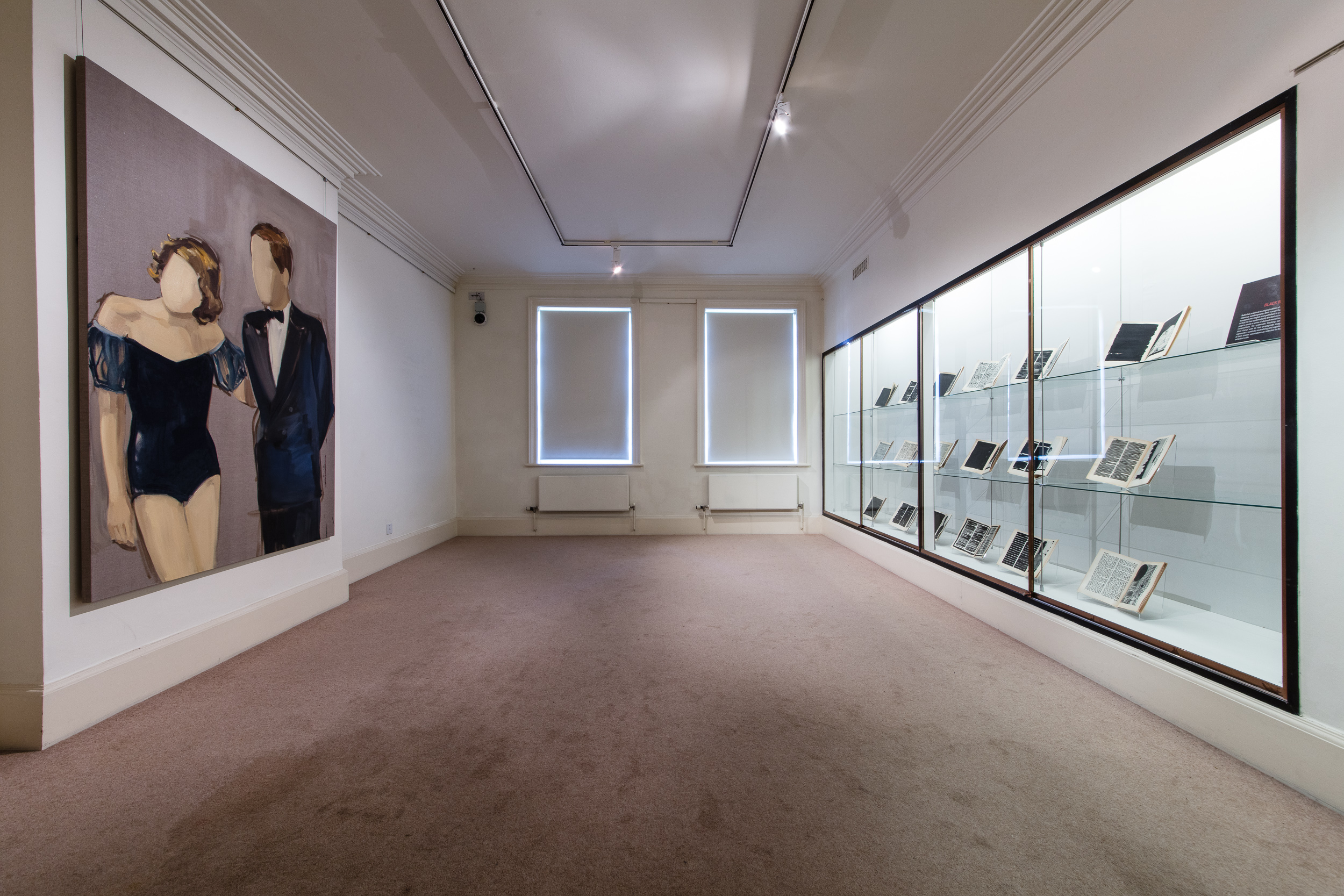 Rubin’s specially created project for Freud’s final residence related to the era of the late1930s, when Freud left Vienna for London. It comprised a series of paintings on canvas, linen and paper with subject matter drawn from original pre-WW2 German magazines that Rubin has collected specifically for the project. These magazines contain idealised images of heath and efficiency to promote the myth of Aryan supremacy as Nazi propaganda. Rubin has subverted these images in his characteristic style by masking out the faces, Nazi references and swastika motifs. This process relates to our human tendency to block out unpleasant memories from our psyche.