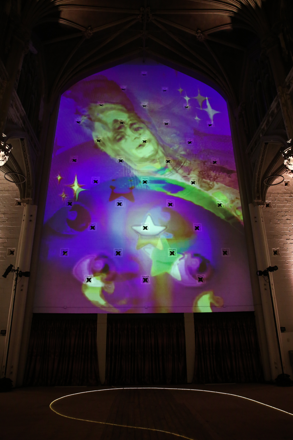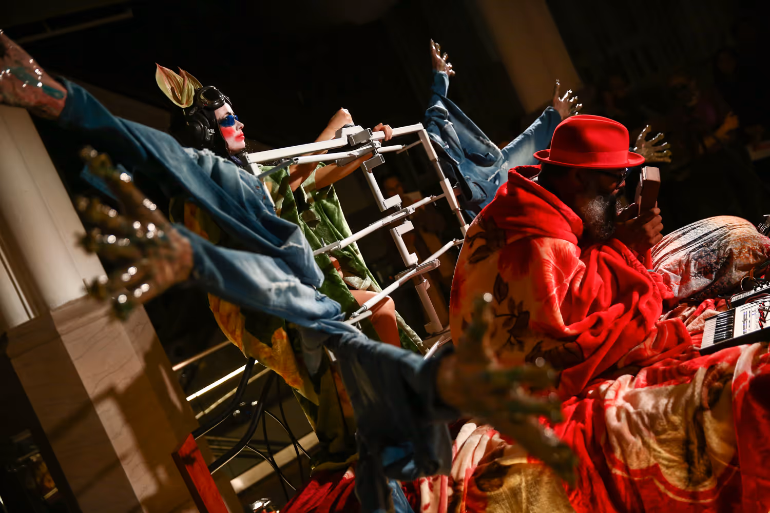 Lemsalu's artistic practice is a mixture of sculpture and performance, she creates visually attractive and surreal fantasy worlds, in which she often plays one of the characters. Lemsalu uses traditional techniques and natural materials, as well as porcelain, to create delicate sculptures and clothing. For Performa, she collaborated with the musician and artist Kyp Malone, in order to create a unique meditative atmosphere. Together with Malone, she presented a live performance that featured sculpture, video, songs and spoken word. The performance was centred around a moving bed on which Kyp Malone produced sounds. The bed seemed to be put in motion by giant waving hands and the "motor" behind them was Kris Lemsalu, who has become part of the installation herself. Becoming part of the installation, through costumes and sculptures, is a characteristic of Kris Lemsalu's versatile artistic practice. Her performance 'Going, Going' allowed the participants to ponder over where we are going in life in general. The location of the performance was the old St. Thomas the Apostle church in Harlem, New York.