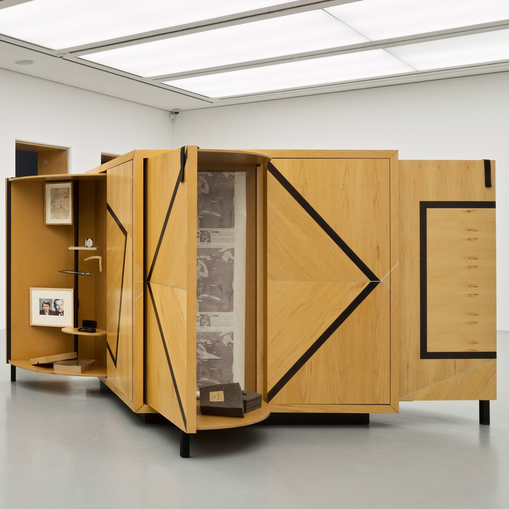 A central work in the exhibition was Goshka Macuga’s Kabinett der Abstrakten (after El Lissitzky) (2003). The work refers to the historical Kabinett der Abstrakten, which was realised in 1927 at the Provinzialmuseum in Hanover by El Lissitzky and Alexander Dorner. The idea of this original work—namely, to allow for a new way of interacting with and viewing art—remains intact in Macuga’s work. Macuga also addresses the specific history of the exhibition venue, since both El Lissitzky and the interim director Alexander Dorner had a very close relationship to the Kestner Gesellschaft.