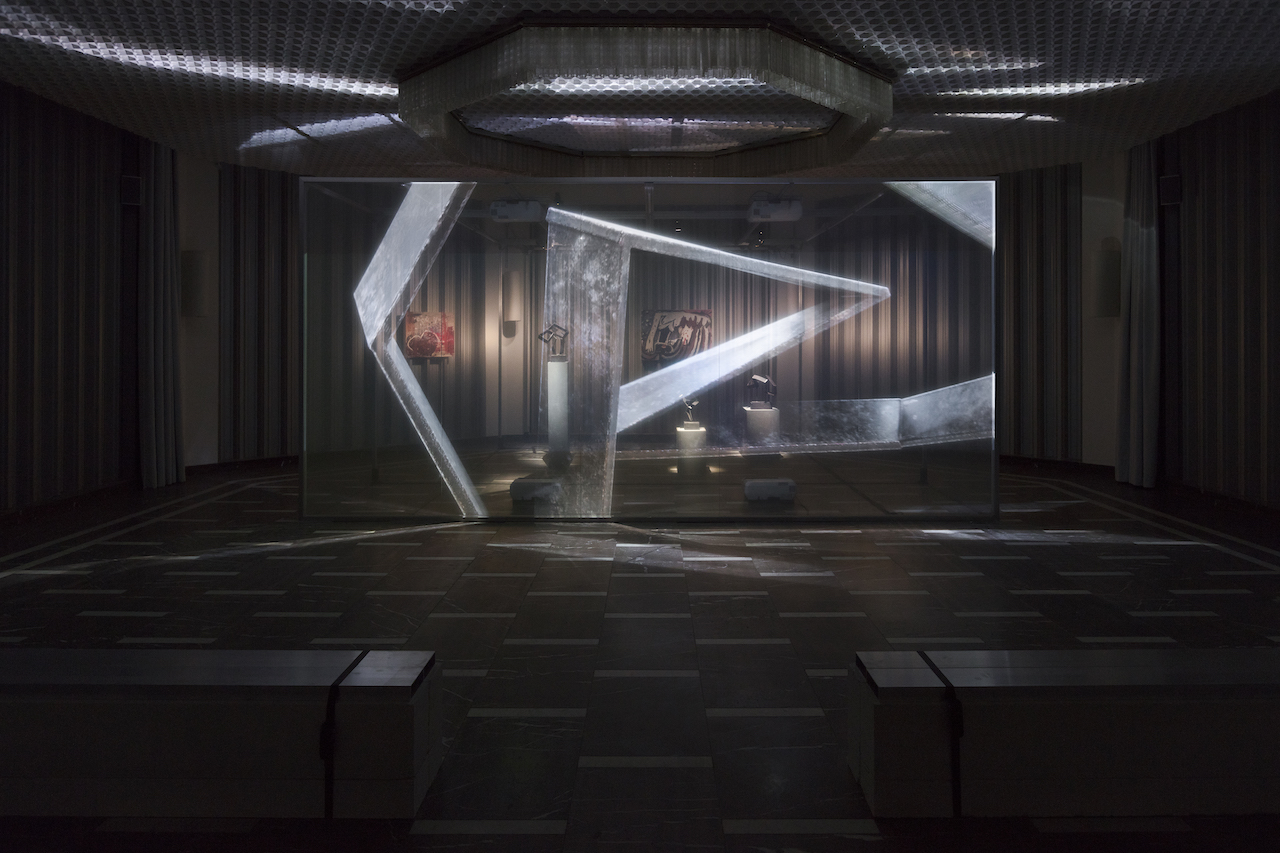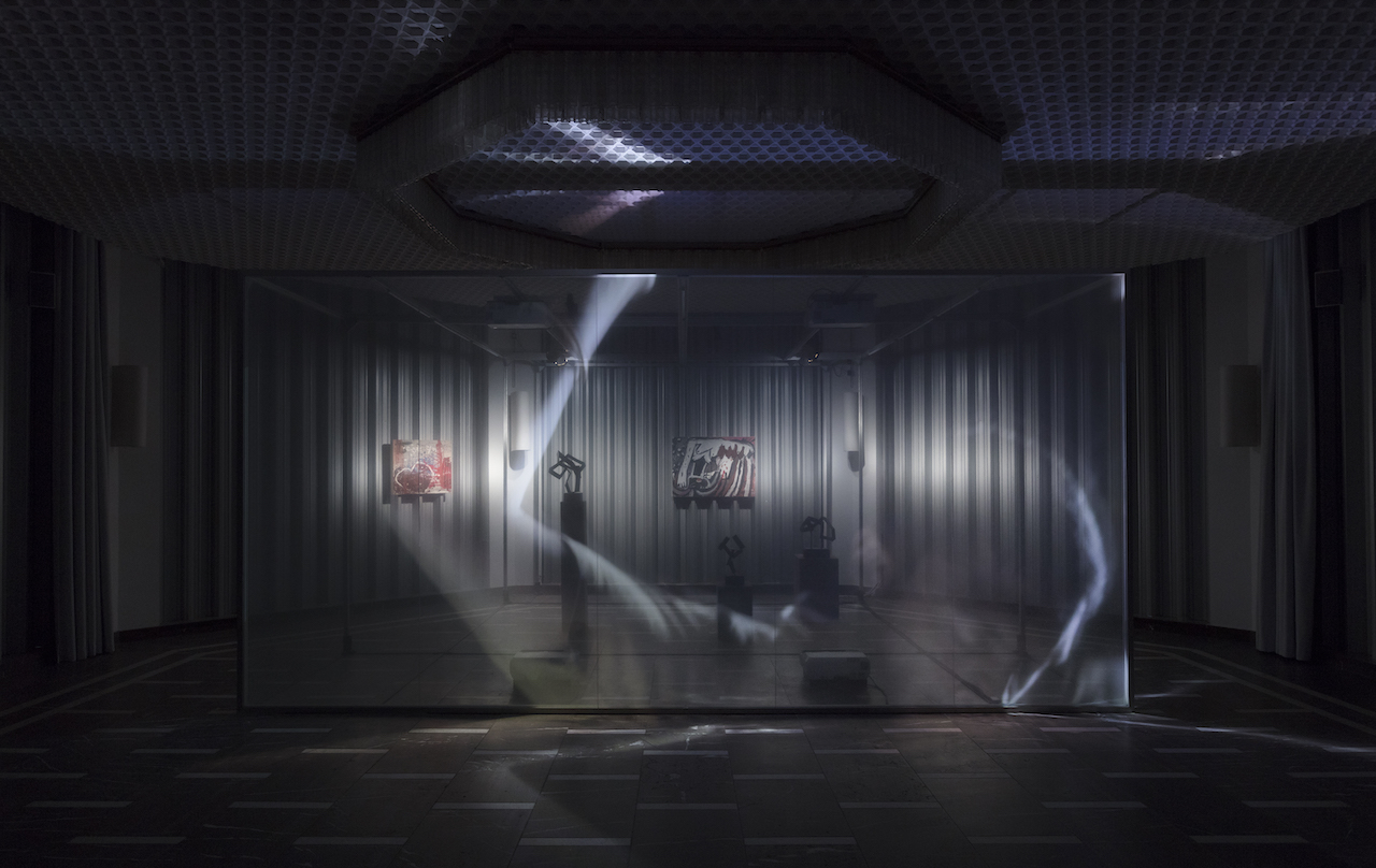 Projected onto a large transparent screen bisecting the Schinkel Pavillon, the film Being Human (2019) forms a three-dimensional hypertext for a collection of paintings and sculptures by Upali Ananda and Kingsley Gunatilake, two of Sri Lanka’s foremost contemporary artists, purchased from one of Colombo’s most influential commercial galleries and presented by Thomas and Kuhlmann as a show-within-a-show. Shot in Sri Lanka, their film traverses documentary and fiction. It features Christopher Kulendran Thomas’ uncle (a family hero who founded the Centre for Human Rights in Tamil Eelam), as well as various guests of the Colombo Art Biennale – a well-known painter, a famous pop star and a young Tamil artist (some of them algorithmically synthesized characters) – who take the viewer on an elliptical journey around the island, from the fallout of the Sri Lankan Civil War to the biennale founded in its aftermath. Examining the idea of creativity as a humanist fiction, the film itself is made through multiple systematic and machinic processes, with characters generated using neural networks running on purpose-built computers and a soundtrack that includes a pop song composed by reverse engineering the prolific Swedish producer Max Martin’s secret songwriting system known as ‘melodic math’.