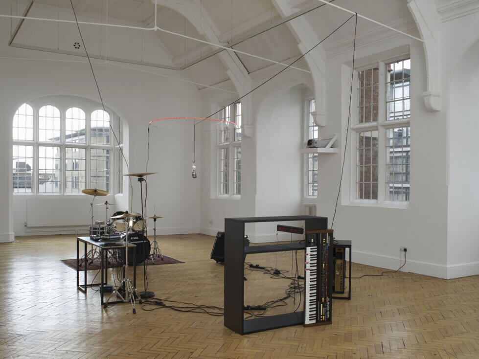 Using an eclectic range of objects and elements including used furniture, outdated electric appliances, electronic materials, light and the appropriated work of other artists, Mirza creates complex audio installations which investigate the moment where noise becomes music. For his new installation made for Camden Arts Centre, Mirza brought together a number of instruments traditionally associated with bands including a keyboard, drum kit and synthesisers fused with turntables, LED lighting, lamps and radios in order to create a minimal audio composition. In Mirza’s assemblages each element plays a specific part; objects affect each other and are reconfigured in different ways.