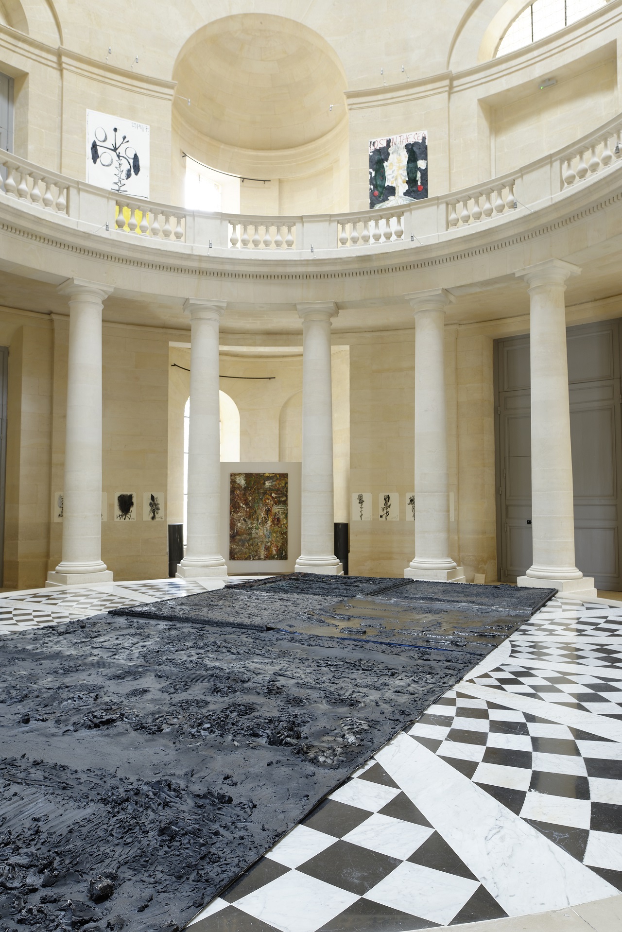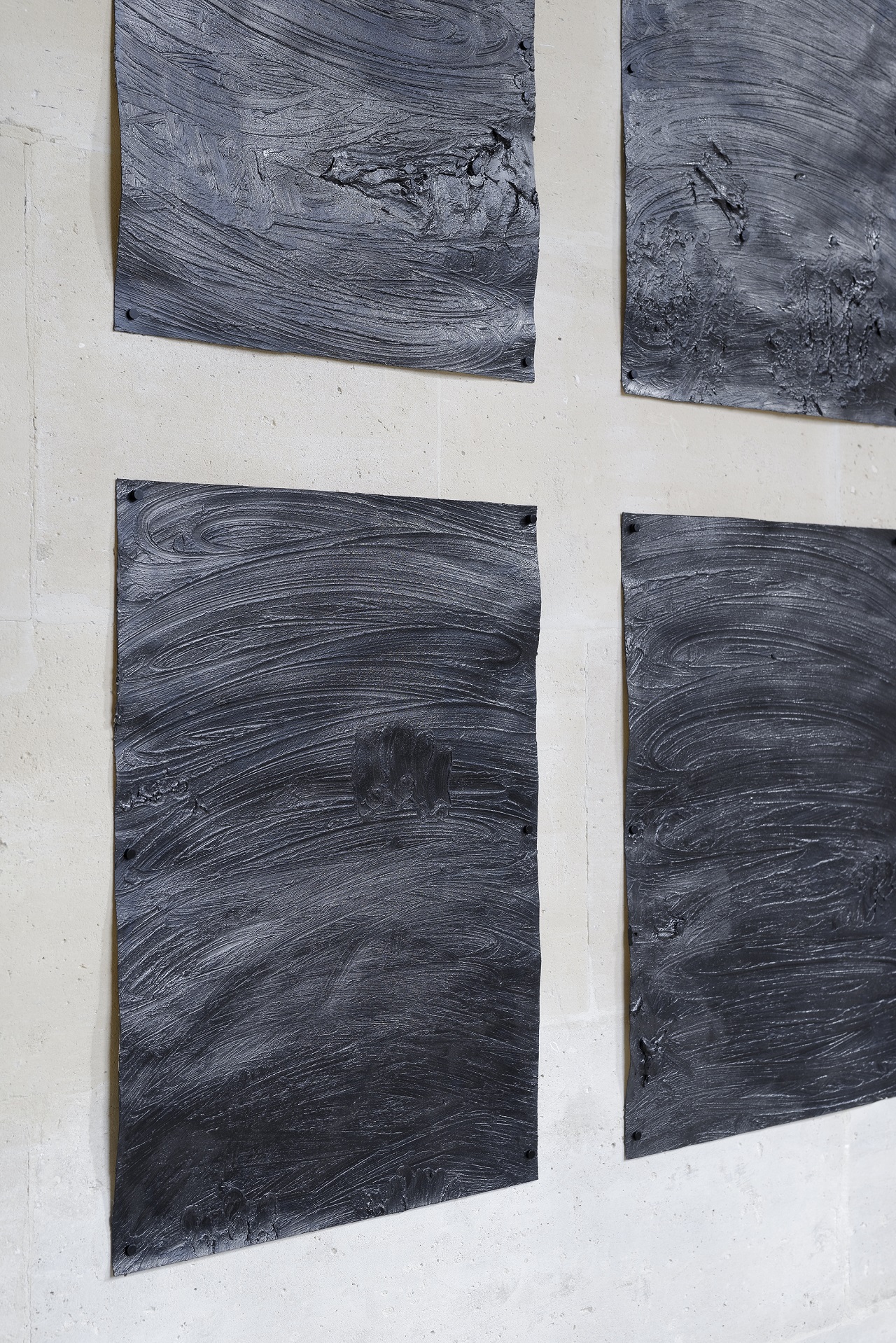 A way of developing the blackness of 2D in three dimensions, the vertical opposing the horizontal. This monumental, towering installation measures 8 x 4 meters and is made entirely of bitumen. There is no attempt at hiding, denying or repressing the marks of past boiling. They are clearly there, fixed, fully expressed through a variety of shapes and sizes from canvas to canvas. Before our eyes stands the abusive history of the destroyed, the crushed, the oppressed.