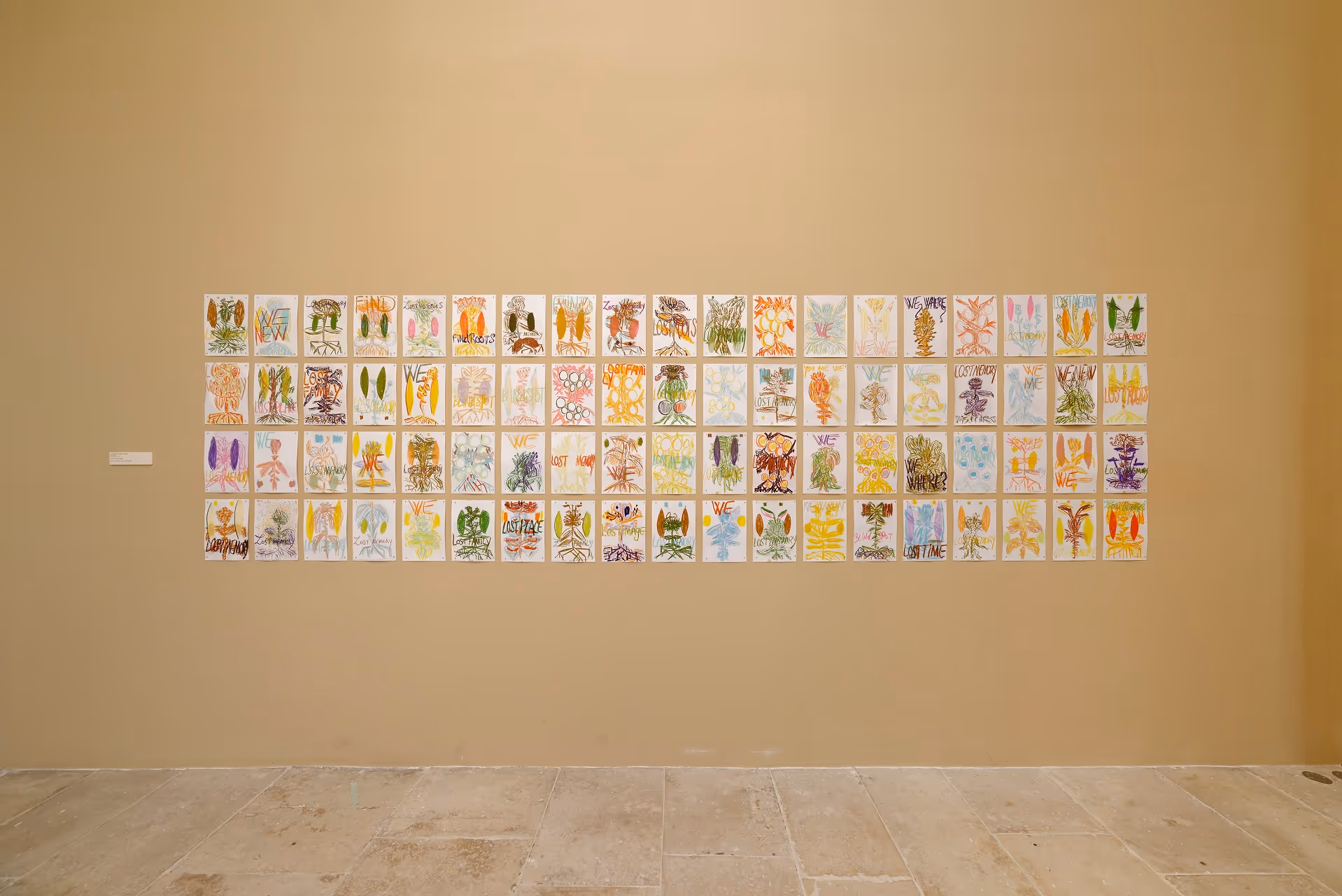 Each flower is embedded with two words: LOST MEMORY and two "blind spots" that symbolize the mental sweeping that alludes to the physical, autobiographical, political and philosophical amnesia surrounding conflicts, occupations and more recently, disappearances. Displayed in batches of 40, the drawings form a kind of flower field with colors the carry life and death, presence and absence.