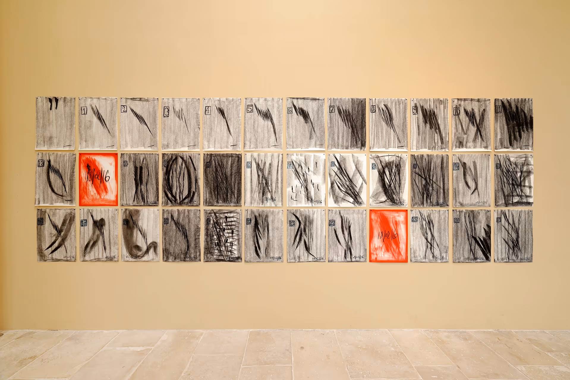 In his monochromatic drawing series Forty-four Sunrises, Joseph Dadoune presents the tear-off sheets of an imaginary calendar. The pages seen here do not correspond with any known dates, rather they measure the time of life and its subdivisions (first sheet: 90 years, 30 days, 12 months). From the second sheet onward, time flies by. Imagine months that last 60 days and years that are 24 months long… 90 years suddenly means living to be 180.
