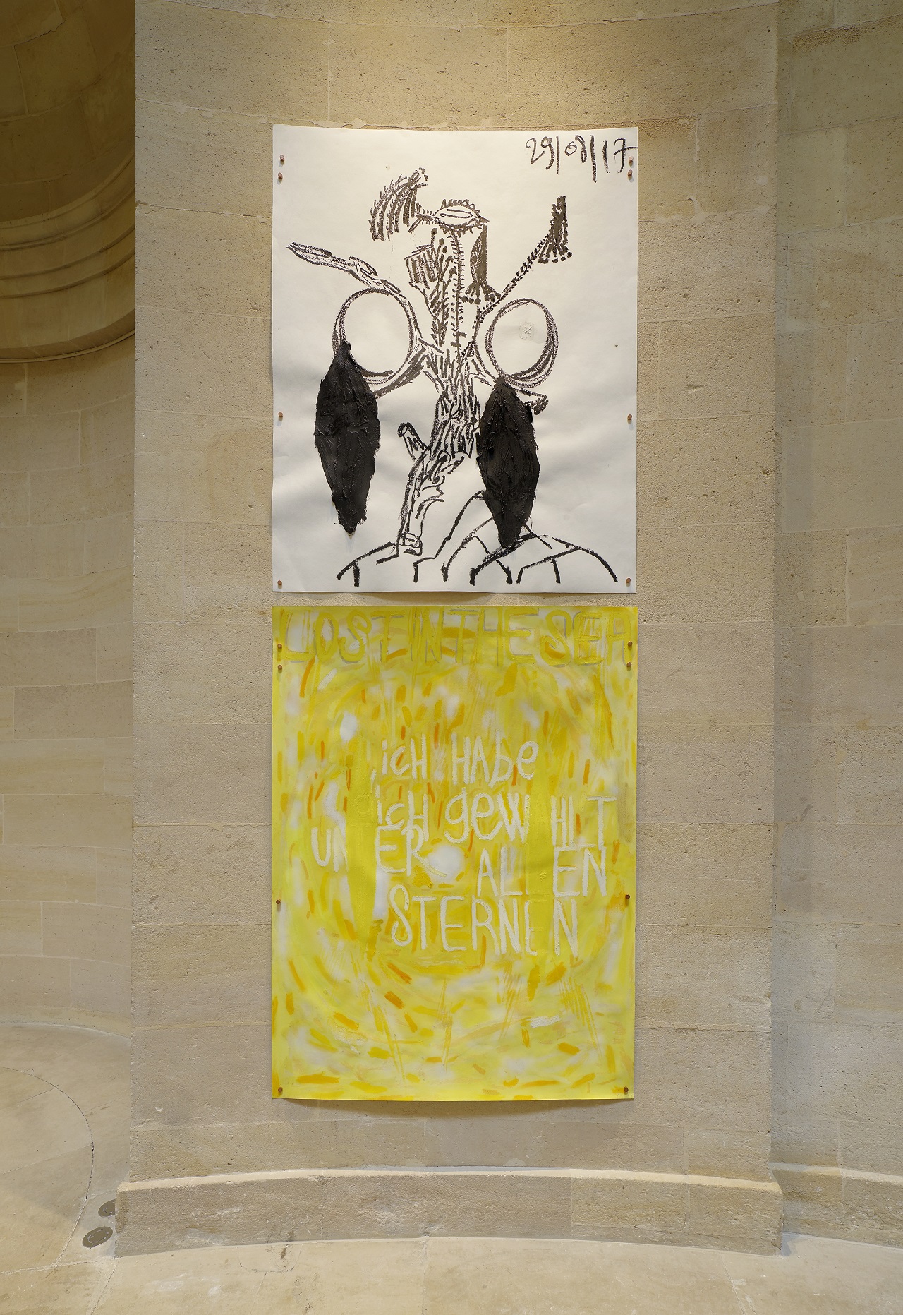 The exhibition "Sillons" was presented alongside Dadoune's monumental "Black Kiosk", three series of works: "Tars", "Impossible Calendars" and "Flowers / After War", providing a complete panorama of Dadoune’s artistic practices and concerns, and at the artist’s initiative, entering into dialogue with pieces from the FRAC Île-de-France collections by artists like Geneviève Asse, Camille Henrot, Eugène Leroy, Aurélie Nemours, Jean Michel Sanjouand, Jean Michel Othoniel and Helen Mirra.