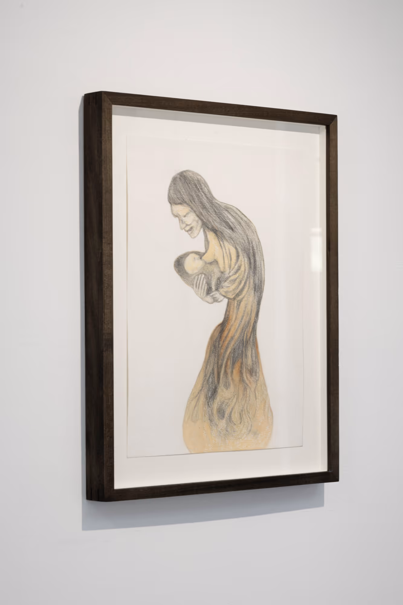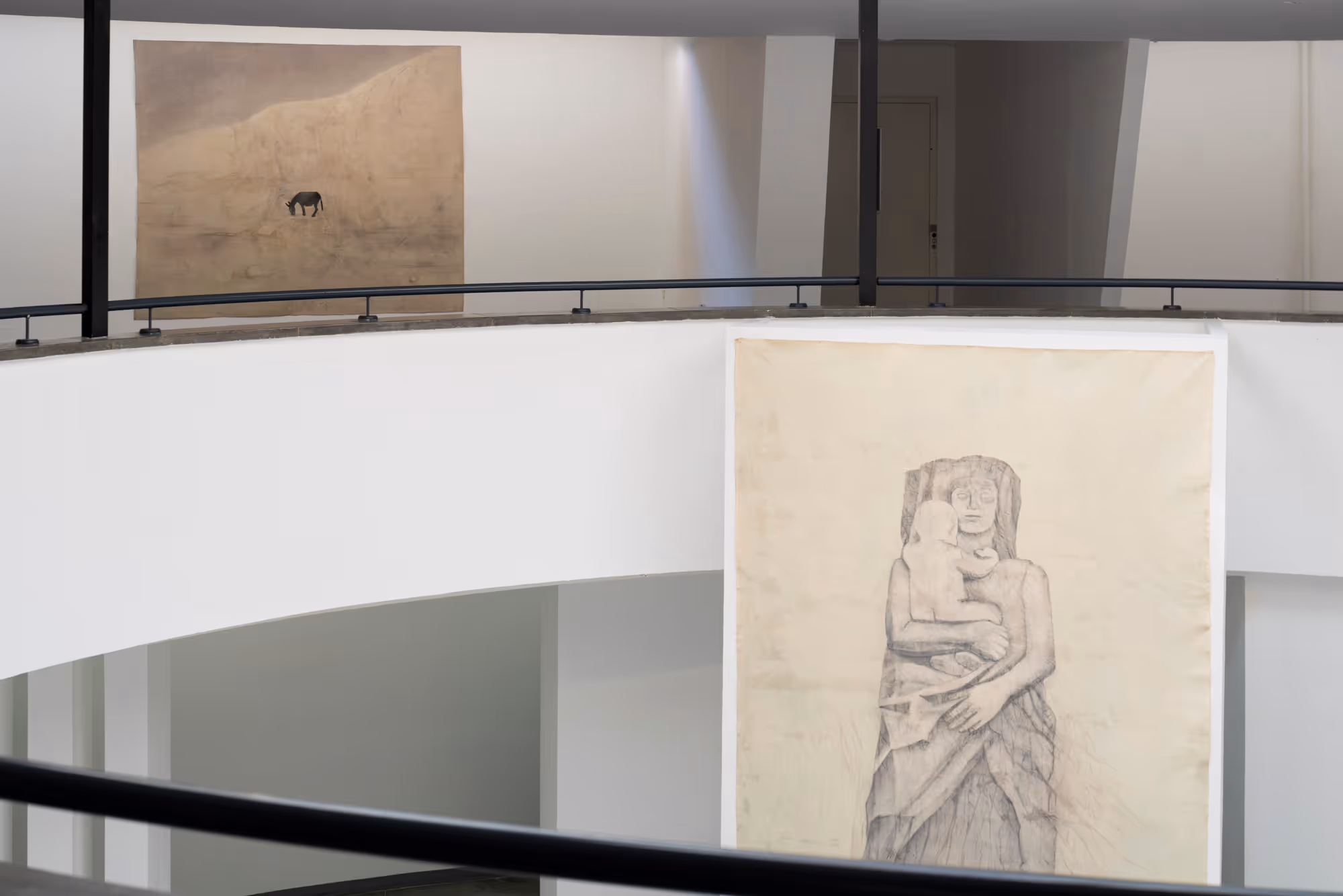 Amid the epochal shift, Turjeman presents a rich visual lexicon rooted in the local landscape yet resonant with echoes of another culture — that of the West, and more specifically, Italy, where the artist has lived in recent years. It seems that a renewed encounter takes shape in her work, between Judea and Rome, between the local and the imperial, between a mythical past and a volatile present. At the entrance level, four works are displayed as an index: A devastated city, a scroll, a ladder, and a woman shielding a child. They encapsulate the various types of gazes activated as the viewers move through the exhibition — from the aerial perspective, associated with flight or attributed to the divine; to the horizontal gaze facing the front, the distance; to a close look at the object, maintaining human scale and physical presence before the painting.