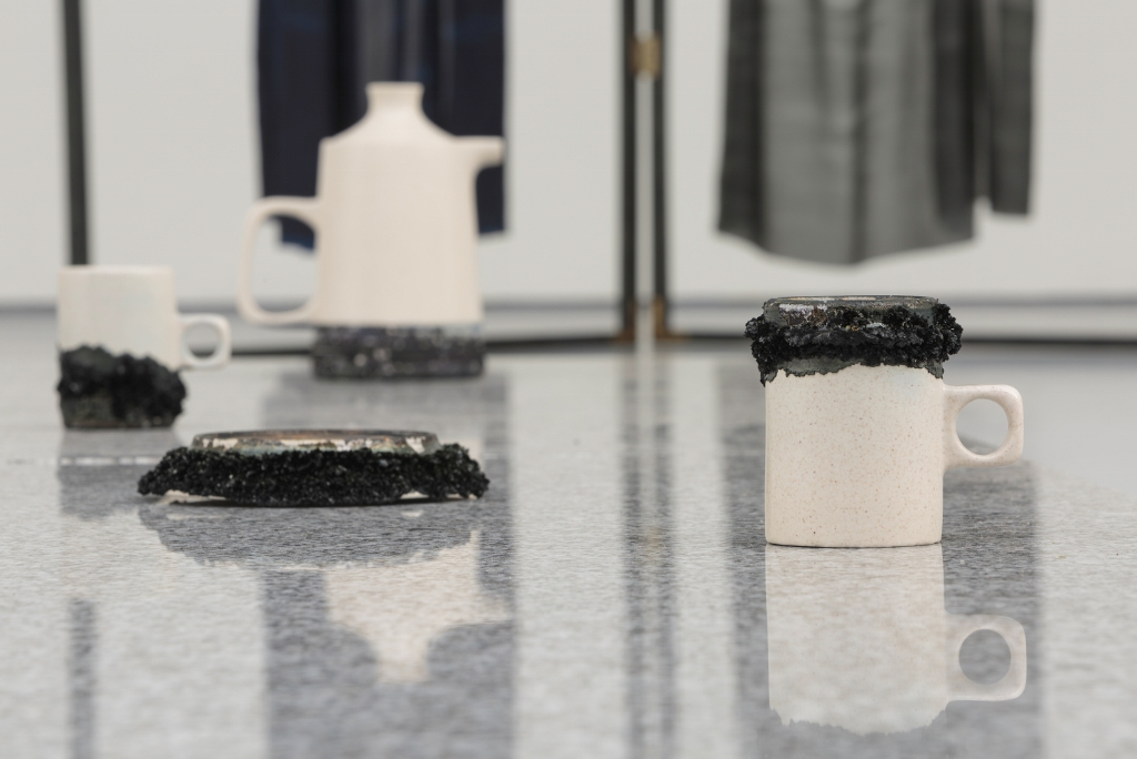 Certain compositions in the gallery also hinted at or made use of photographic processes. Macintyre grew crystals from the same chemistry used in the cyanotype paper coating process: some of these structures were grown during a summer heatwave and had a dense, spiky appearance whereas others grown during colder months were softer and less structurally developed. Here, she was interested in the overlap between substance and time – how an artwork can form a record of the conditions under which it was made.