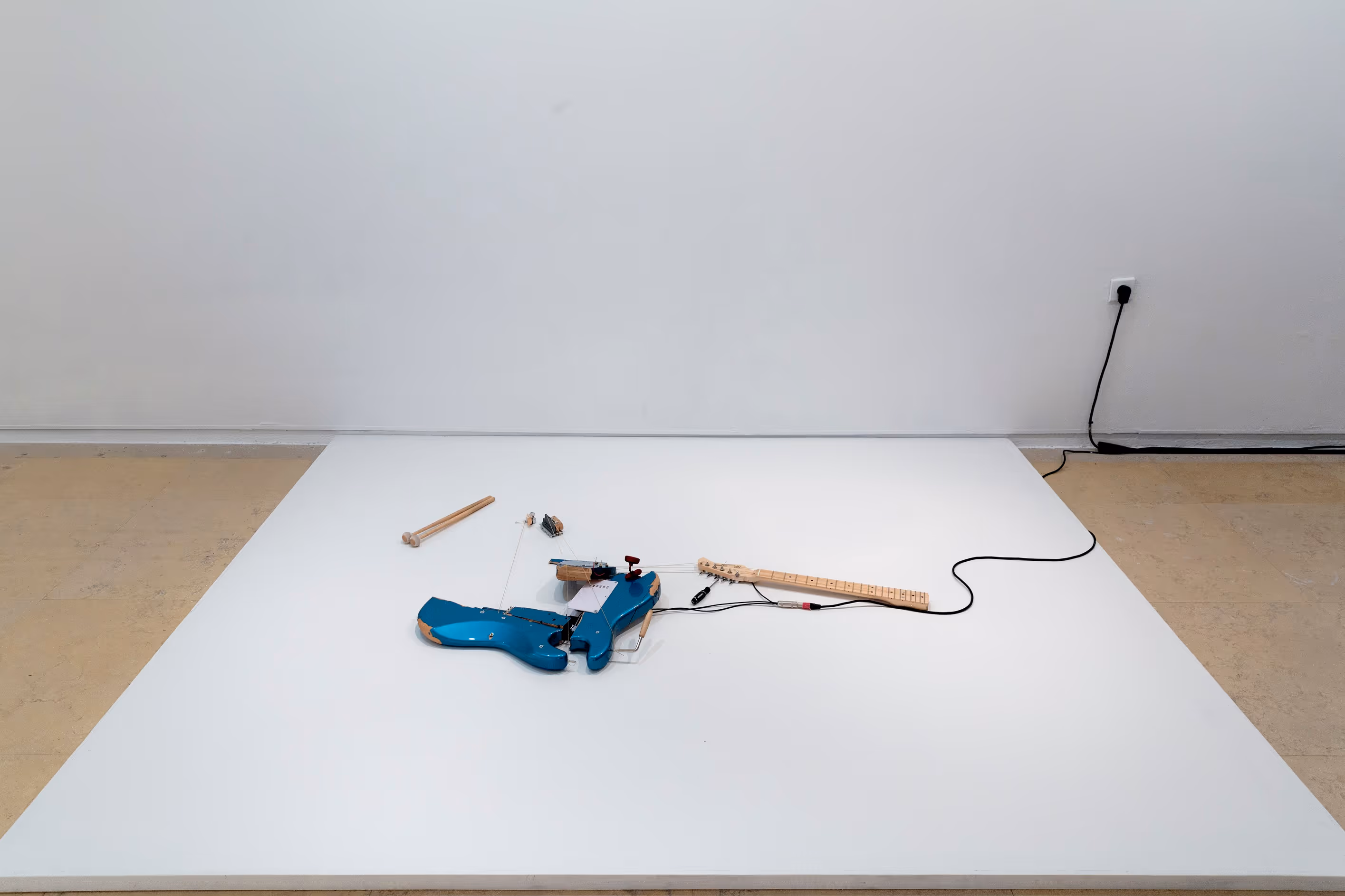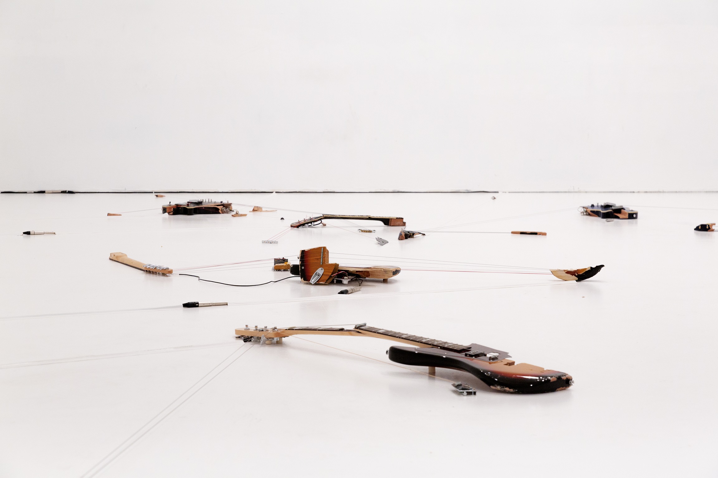 Naama Tsabar (b. 1982) creates sensually driven installations, performances, and sculptures that evoke questions of power and bravado found in musical and social environments. Her work investigates intimacy, performativity, sexuality, and excess with minimalist aesthetics. Throughout her practice, Tsabar repeatedly returns to the iconic act of breaking the guitar. In this series of large-scale installations, titled Melodies of Certain Damage, broken guitars were scattered about the gallery. Strings were reattached to the musical "debris" in an unconventional way, creating a constellation of resynthesized instruments – a phoenix rising from the wreckage.