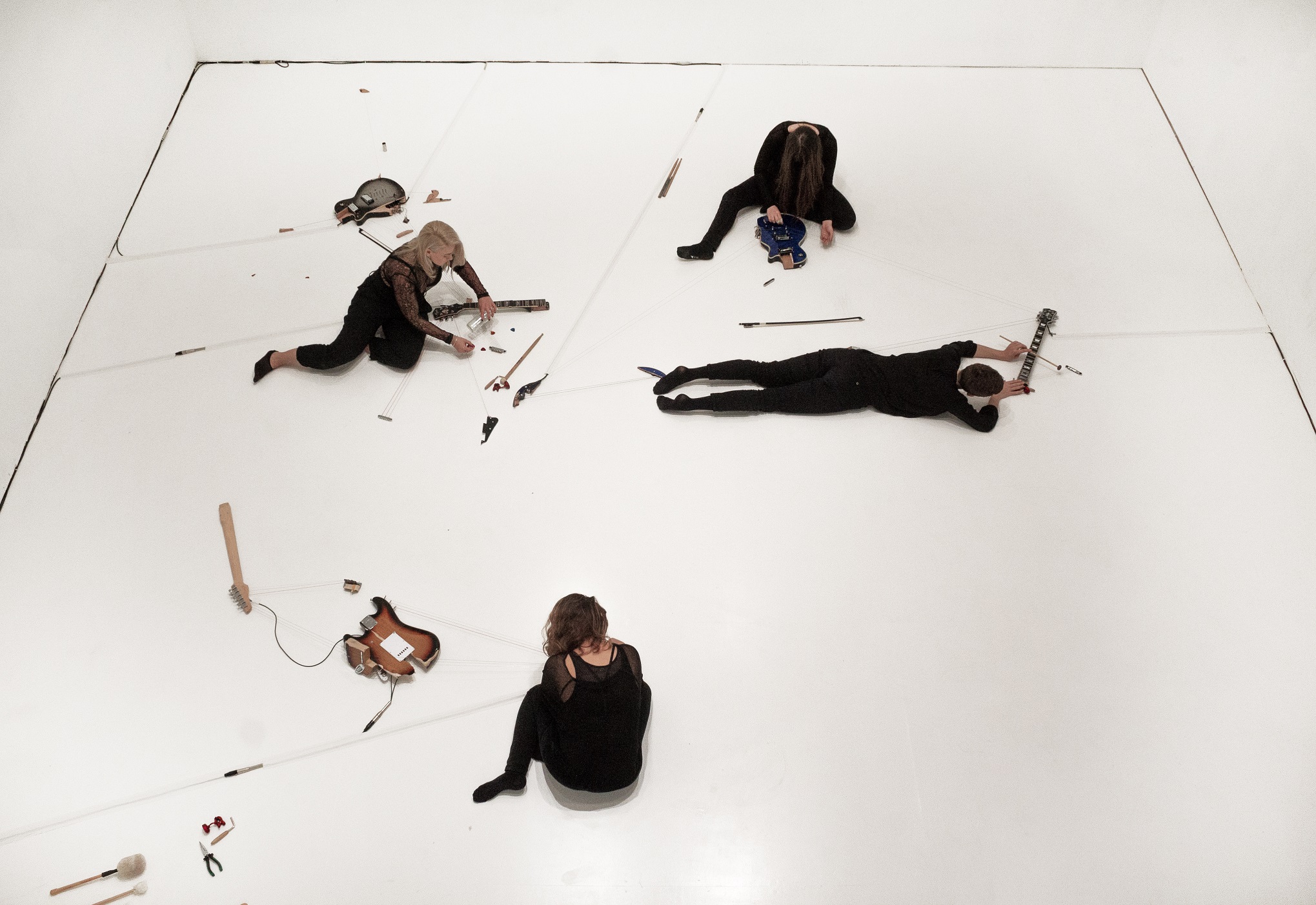 Tsabar’s striking floor-bound installation imposed a unique configuration between instrument and body. To play the instruments-cum-installation, visitors must laid on the floor next to the pieces, or find other positions with which to interact with the work. Such a choreography engendered a vulnerability within visitors or performers, generating a new kind of intimacy between the instrument and its activator. Transforming the remains of the iconic action of breaking a guitar into a new functioning order in many ways undermines its historic gendered manifestation in Rock ‘n’ Roll. The image of the male rock star, able freely to express anger and rebellion, and to impose violence, has become almost paradigmatic today. By maintaining the composition of the guitars as they originally fractured when broken, Tsabar focused on the aftermath of the violence, the debris. Transforming the remains, perhaps even the victims of violence, into a new and beautiful landscape is an empowering female act. For this reason, Tsabar chose to collaborate and empower musicians who identify as female and gender non-binary. She worked with them to compose a space-specific performance. Visitors were also permitted to play the works through the run of the exhibition.