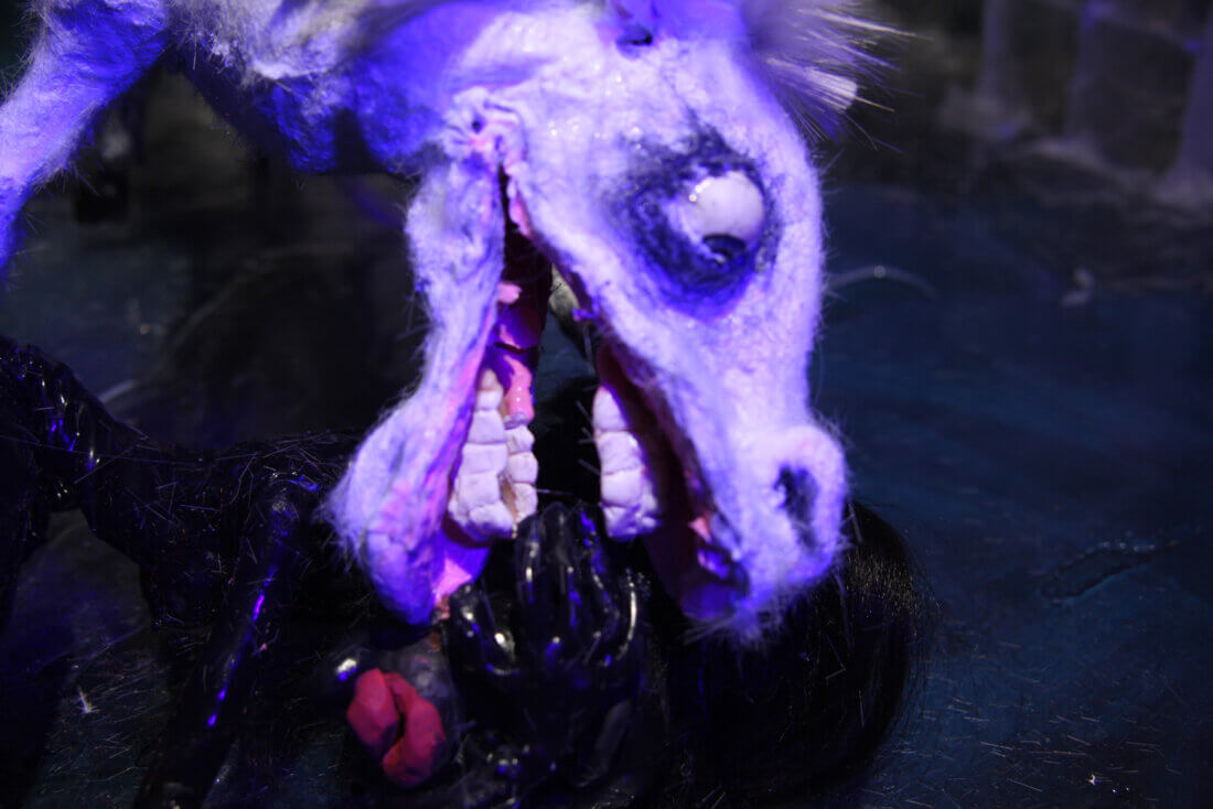 Djurberg creates her films with a technique referred to as ‘claymation’. At the Venice Biennale in 2009, she embedded the animations amongst a sprawling jungle of life-sized sculptures immersing the viewer within the immediate materiality of the images depicted on screen. Similarly, A World of Glass displayed the luminous sculptures that appear in the films, made from polyurethene – a material that shares the apparent fragility and elegance of glass.