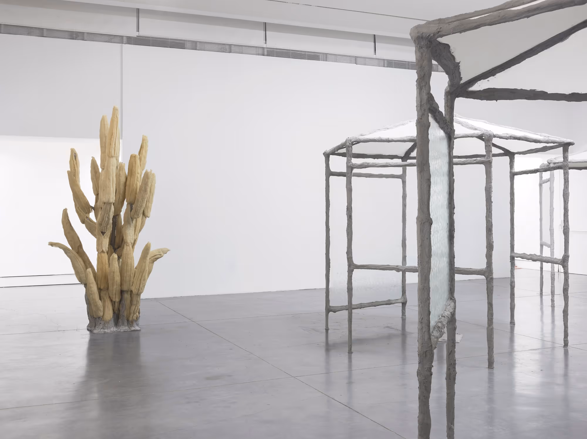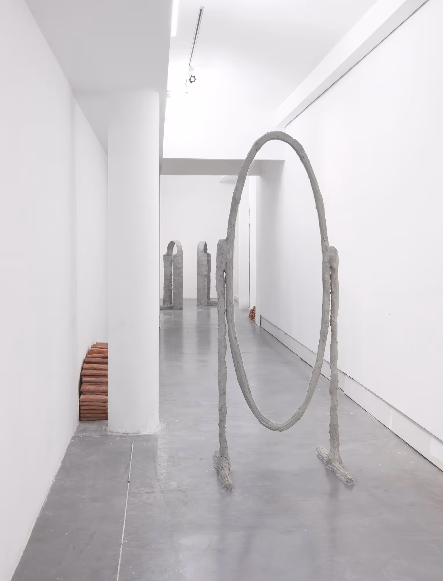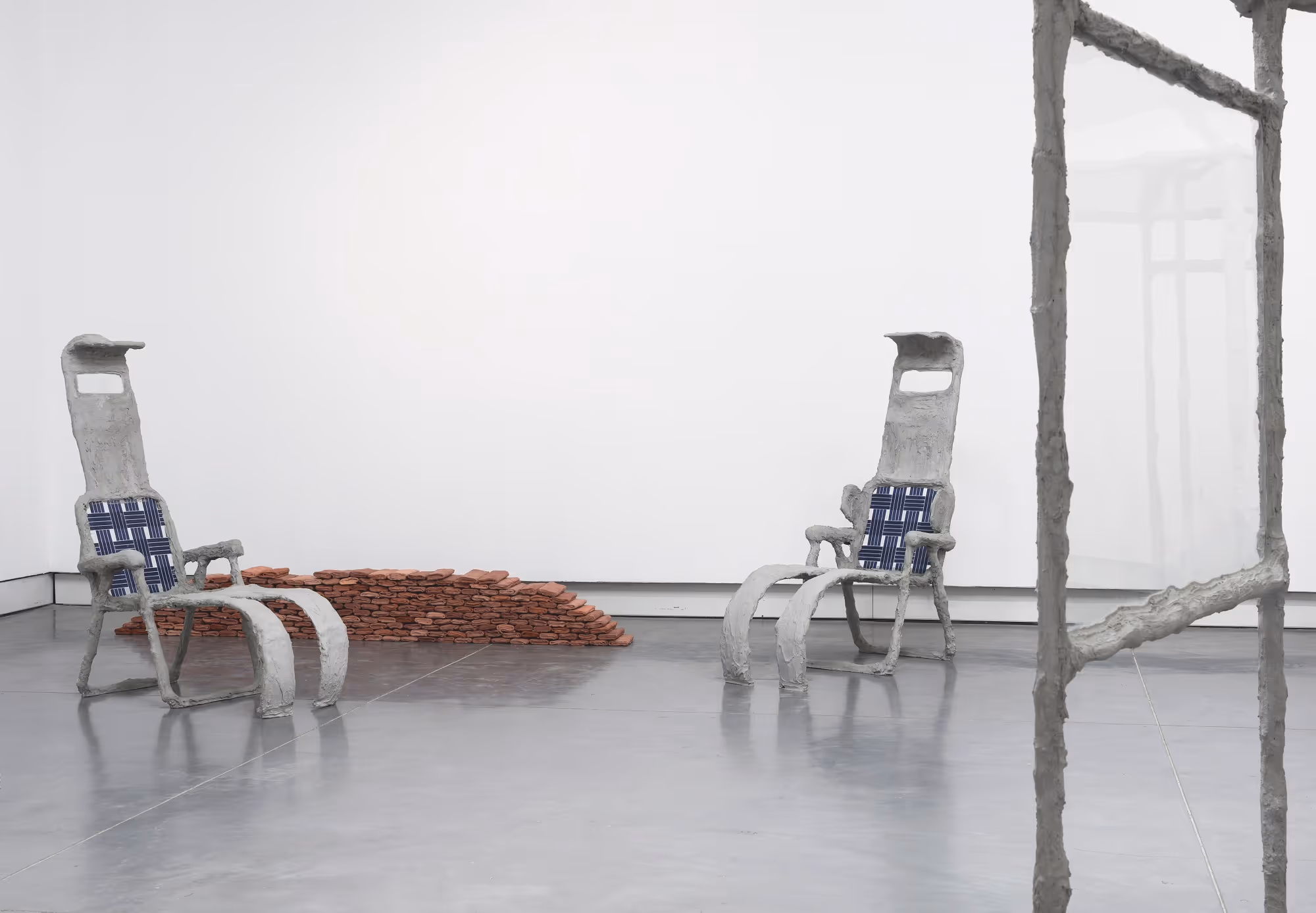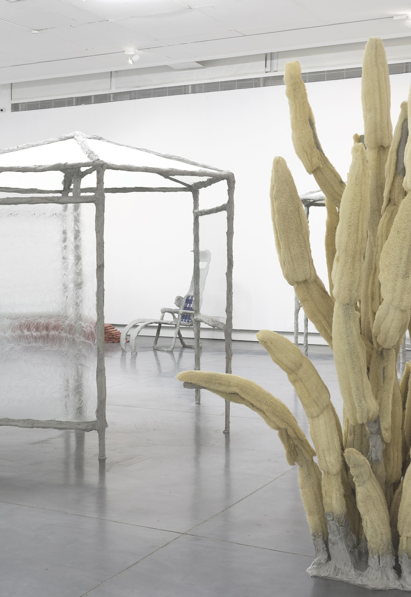 Familiar mundane objects and substances, such as towels, mirrors, deck chairs, a cactus, a sponge, and Vaseline were restricted in the space, as their installation amid crude, phallic concrete columns made the viewer wonder where he is. Ostensibly left behind by absent people, the objects prevented one from determining their identities or from concluding who they were and what will become of them. Pinhassi subjected his materials to an alchemical process, during which soft becomes hard, liquid transforms into solid, the full turns empty, and the pleasant—unsettling. Examining them by human scale implied subordination of the architectural elements to questions of identity, both private and collective.