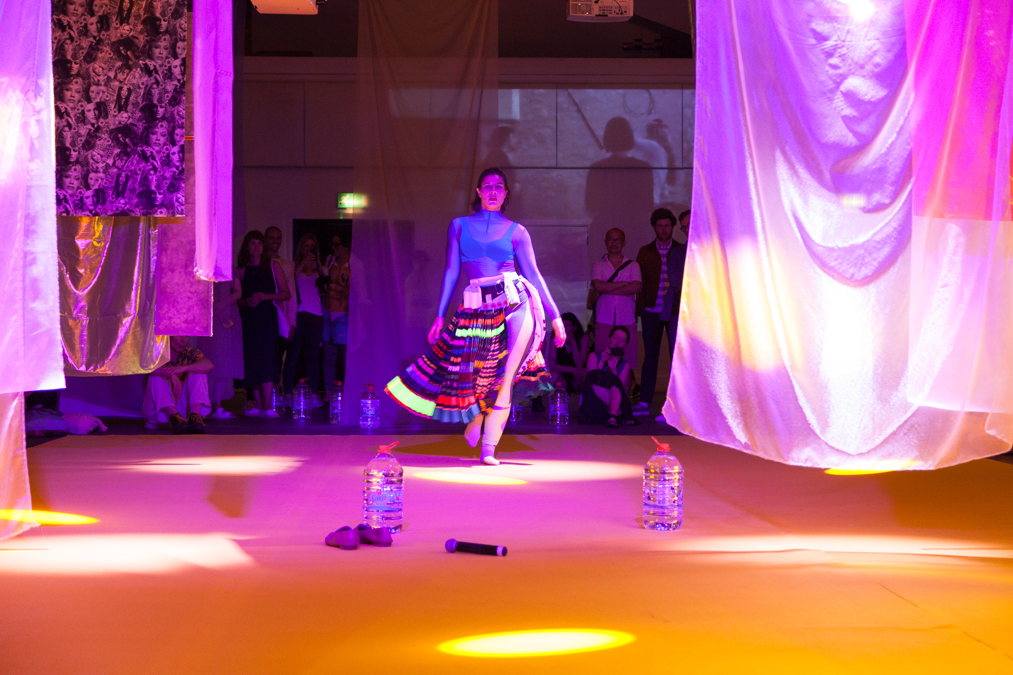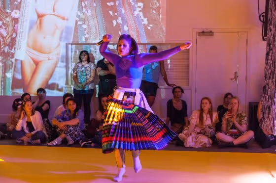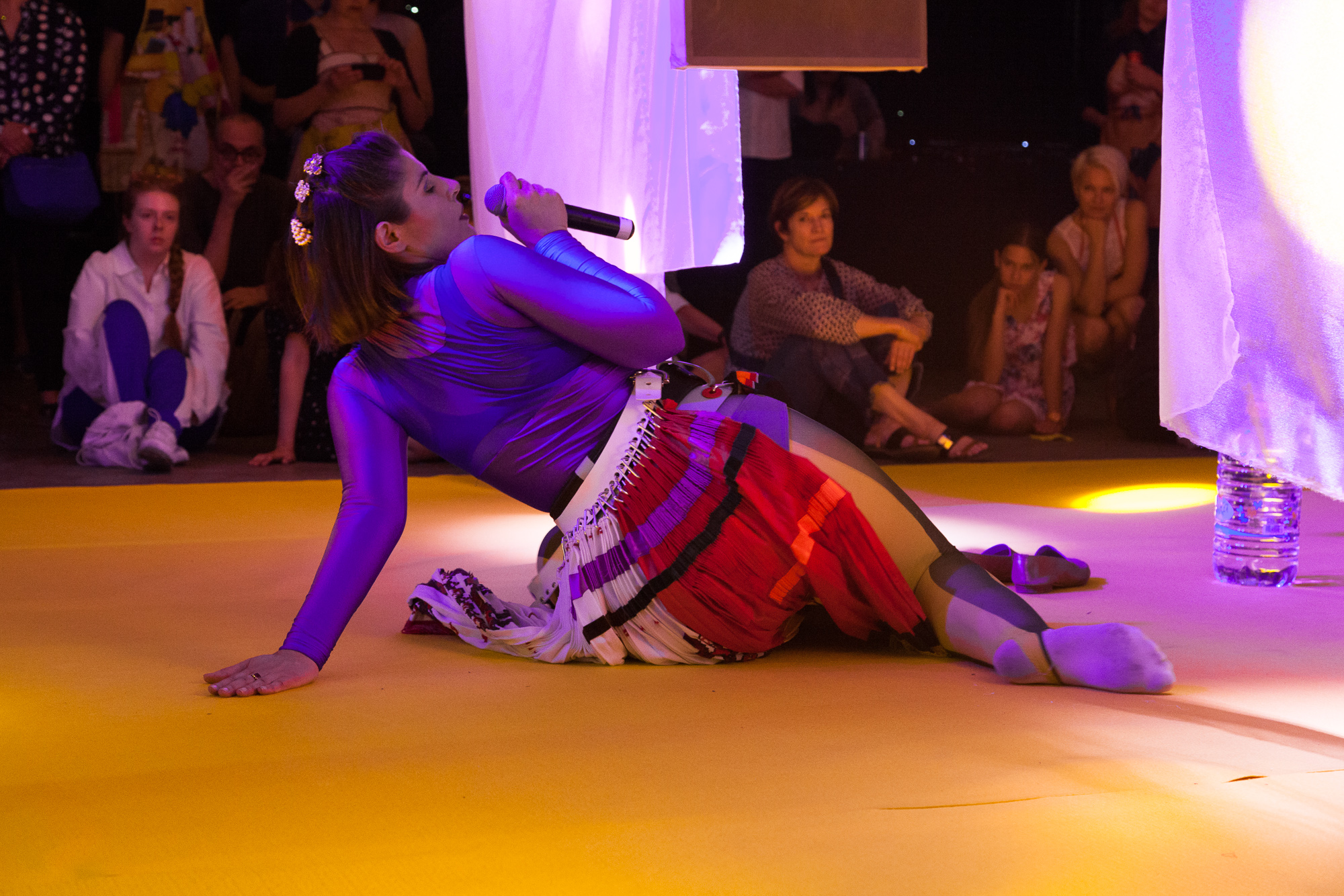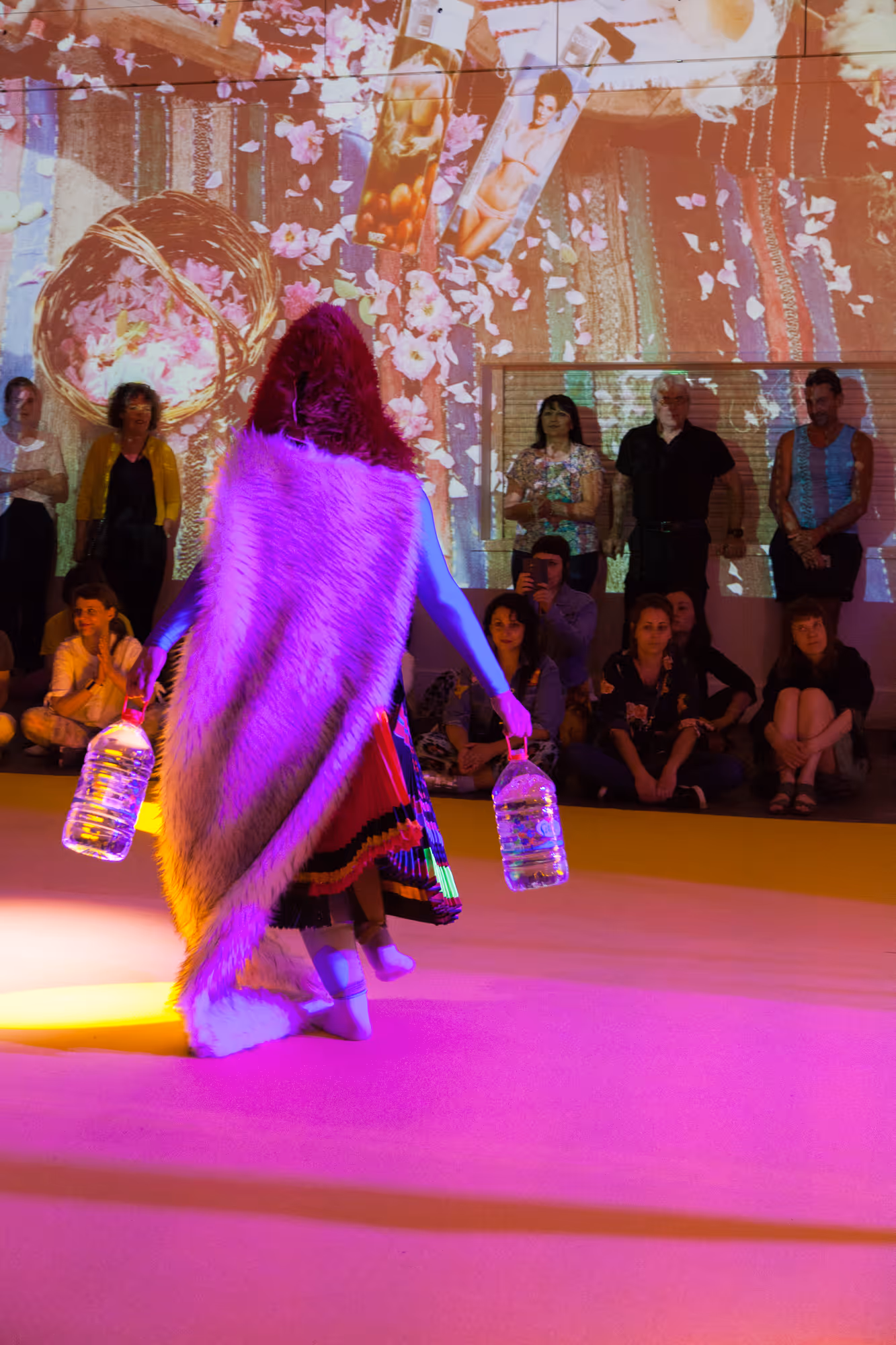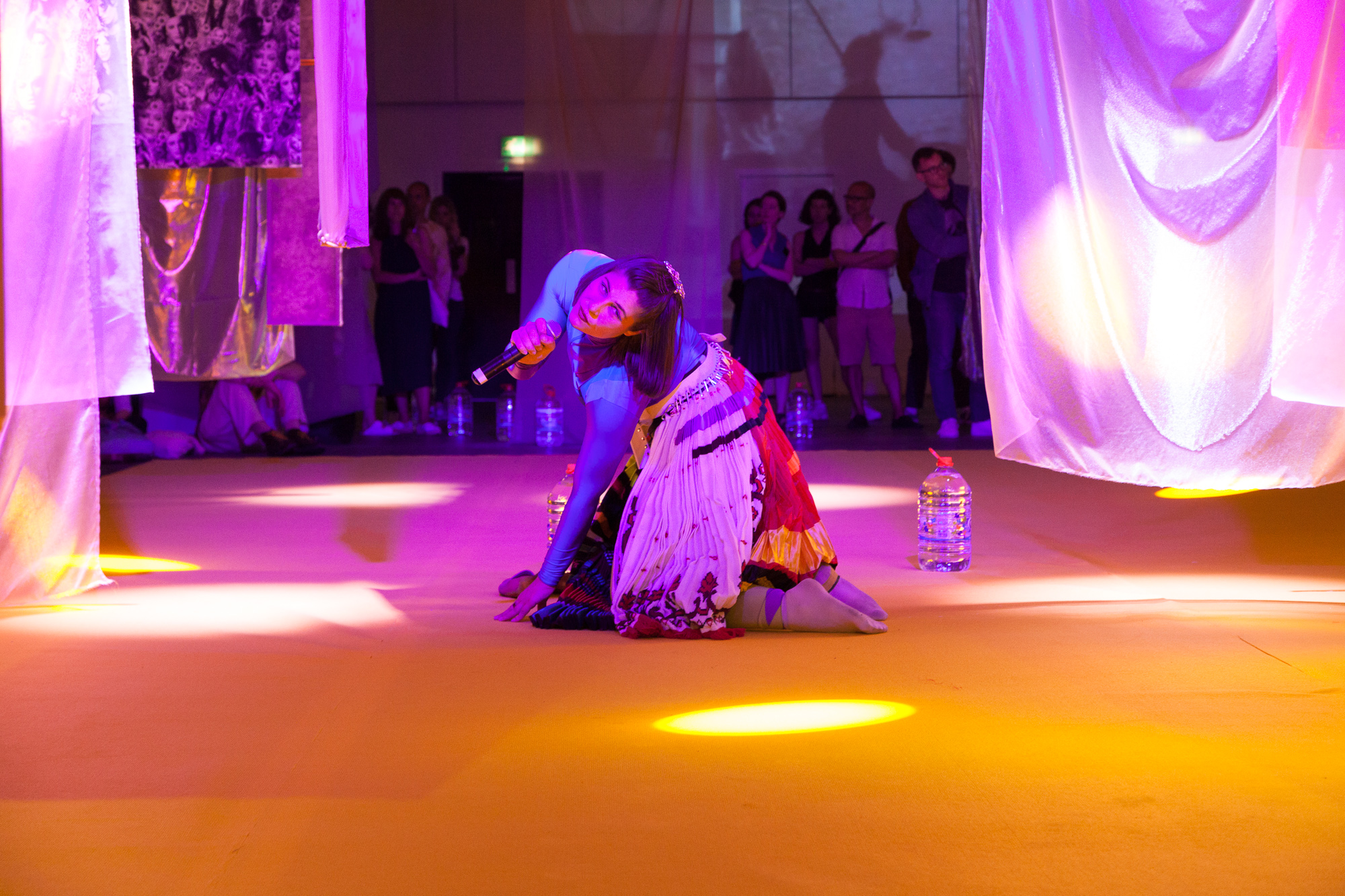 The work examined folk, local or provincial culture, its 'purity' and its relationship to nationalism when considered within the influence of a more commercialised, neo-liberal and individualistic sense of culture and pursuit of collectivity. The artist used her own body as a sight for these considerations and reconfigurations. Expanding on an arc from melancholy to euphoria, the idea of the work was to occupy several stylistic references whilst embodying them to the full, leaving the viewer to question the authenticity of the performer while not being able to deny its wholehearted engagement.