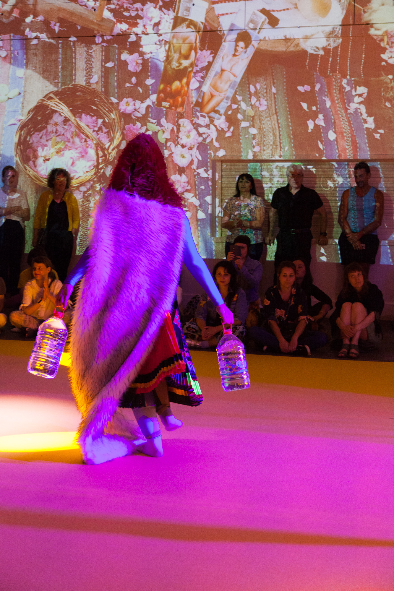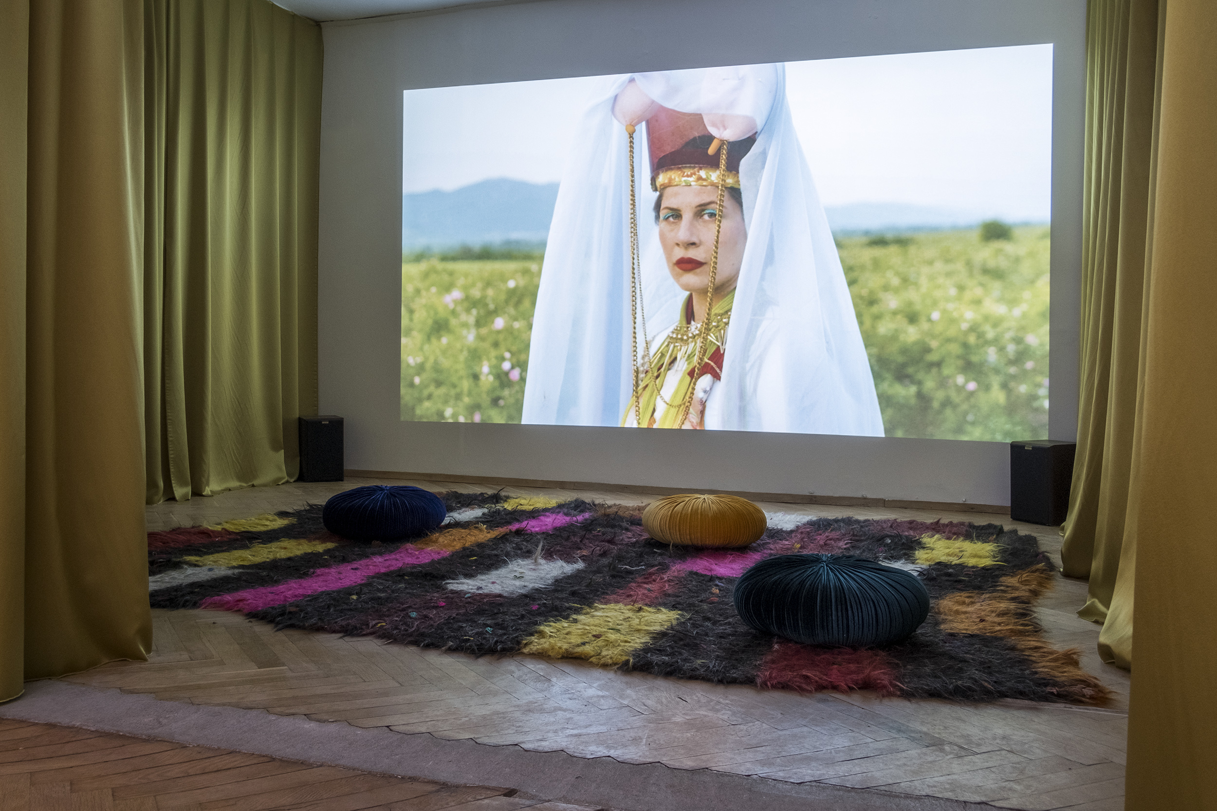 This new commission was presented as a performance within an immersive installation. Oval Space was transformed into a space suggestive of something between an ethnographic museum and a national embassy using heavy fabrics as well as acoustic panels made of raw sheeps' wool and domestic textiles. Coloured lighting dressed the space and a single video projection screen provides subtitles and moving images at various moments throughout the performance. The artist appeared clothed in an elaborate sculptural costume resembling a traditional ceremonial dress: a bricolage of hand-made elements and glamorous fabrics combined with everyday materials, topped off with a spectacular cascading headdress. Georgieva appeared almost as an object on ethnographic display on a rotating stage and sang a melancholic lament, adapted from her time in a Bulgarian folk singing masterclass. As the set progressed, elements of the costume were removed by other performers who placed them on museum like display stands.