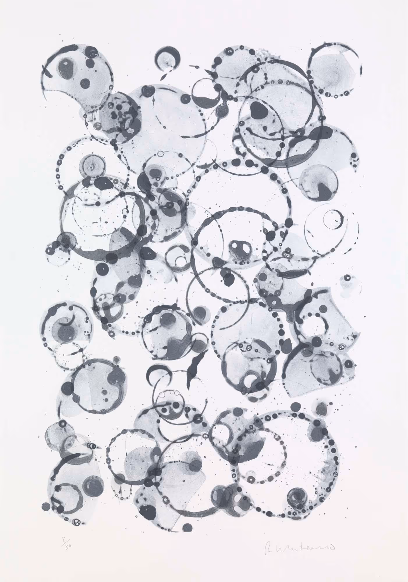 The circles in Untitled (Bubble), are by contrast, suggestive of the traces of an invisible virus. In denser areas of the print, where the viewer sees ‘a bubble within a bubble within a bubble’, as Whiteread describes, that original idea of celebration lingers. In the overlaps between bubbles, the viewer may be reminded of those ecstatic moments when reunited with loved ones.
