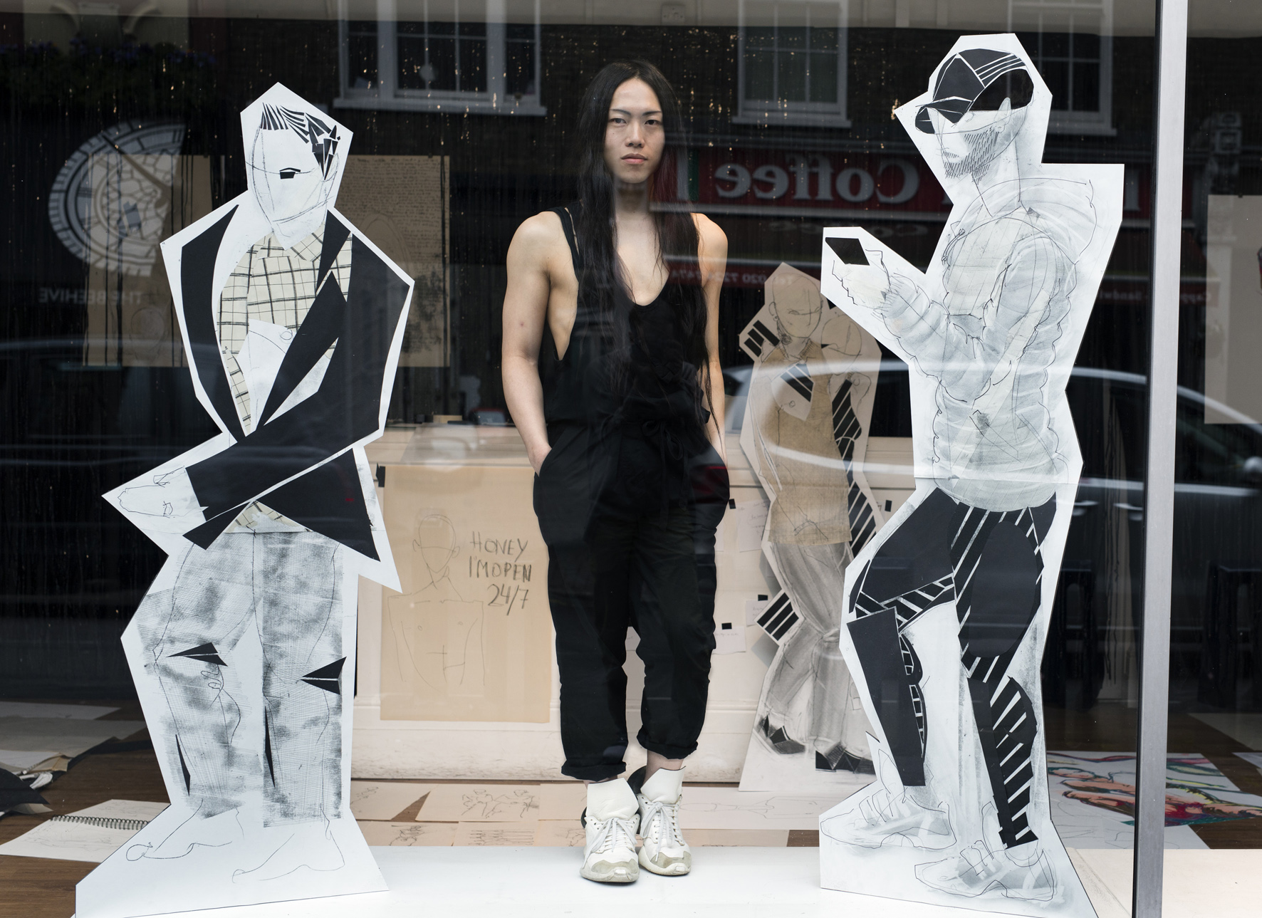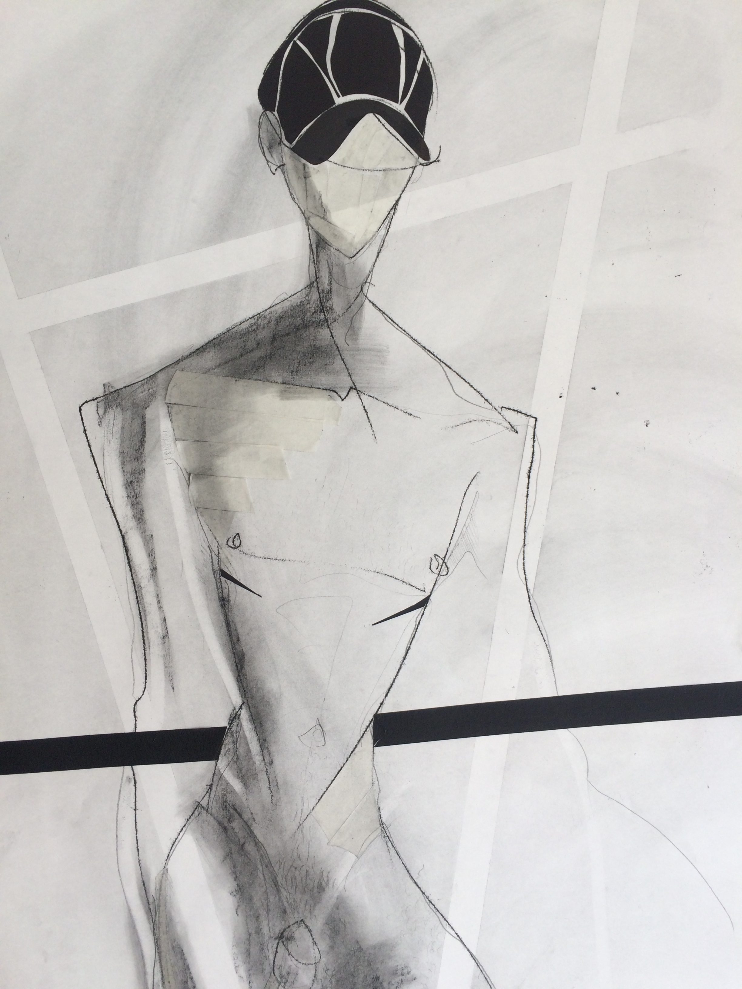 In this Outset studio residency, passers-by could watch Le Fil work through the giant windows of the part-studio, part-exhibition space as he blurred the lines between public performance and private process. Using this concept of revealing the hidden to underpin the work, he has created an evolving installation of drawings with explorations of the sculptural body through collage, monoprint and conversation. The revealing artworks featured naked male figures, cheeky voyeurism and a central window installation that combined public faces with private silhouettes as it re-imagined the secret lives of the window’s passerby’s. With these studies, Le Fil examined how we shape our private selves for public consumption.