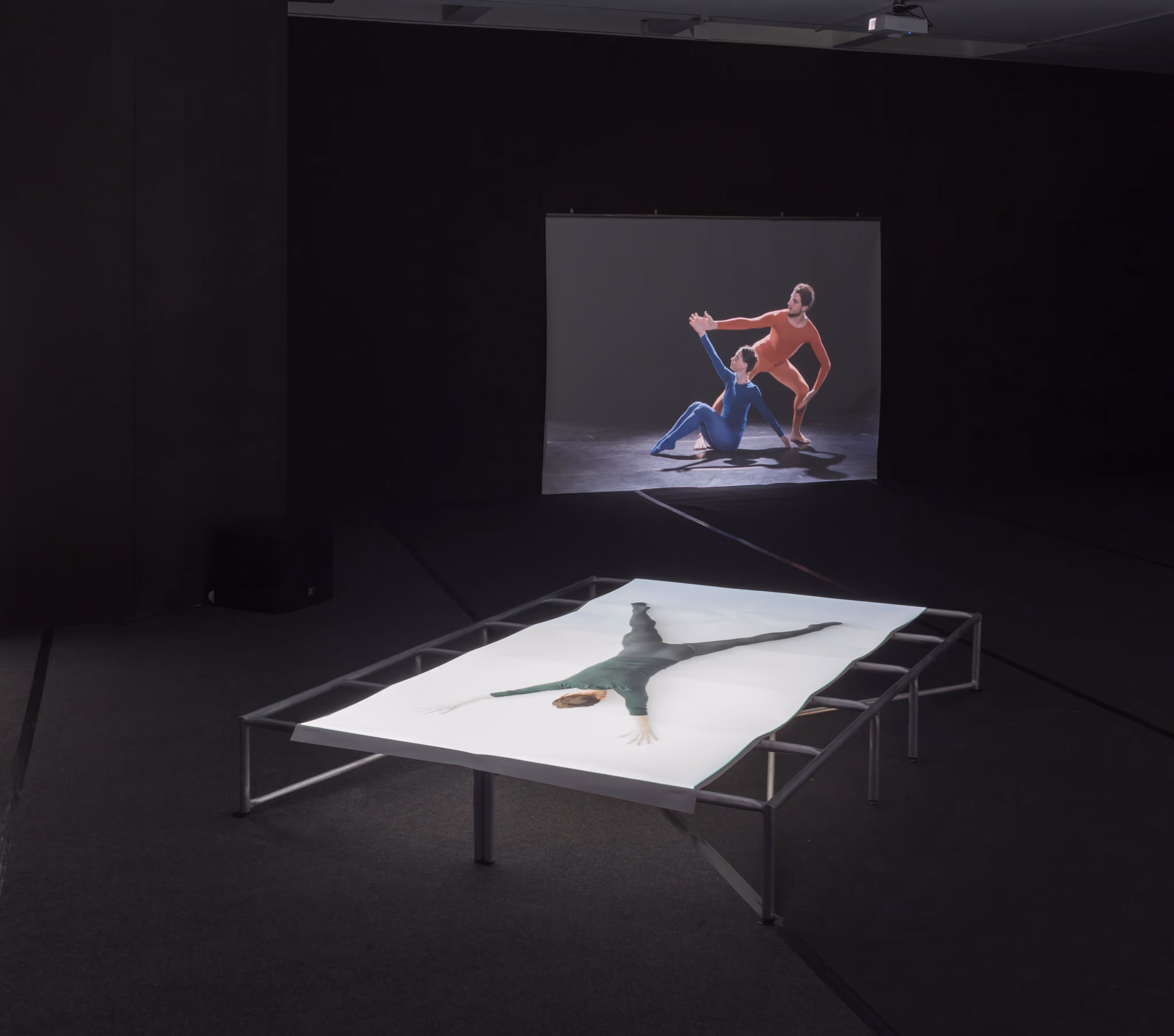 The video installation fused together elements from the bodies of work produced by both Oren and Ben Ari. It was composed of several screenings scattered around the space, some of which were projected on papers fastened by metal constructions. The screened images showed dancers holding postures extracted from Oren’s choreographies or inspired by them. Their screened, almost life-size bodies were supported by the constructions and assimilated into the two-dimensional fragility of the paper. Together, the postures and sounds made up a new spatial choreography that conjoined visual art and dance, with their different modes of composition and conditions of viewing. Moving around the space, the spectators assembled the subtle, fragmented movements performed by the dancers in the images strewn across the space. In doing so, their own presence became an additional element in the composition, altering it and conferring further meaning on it.