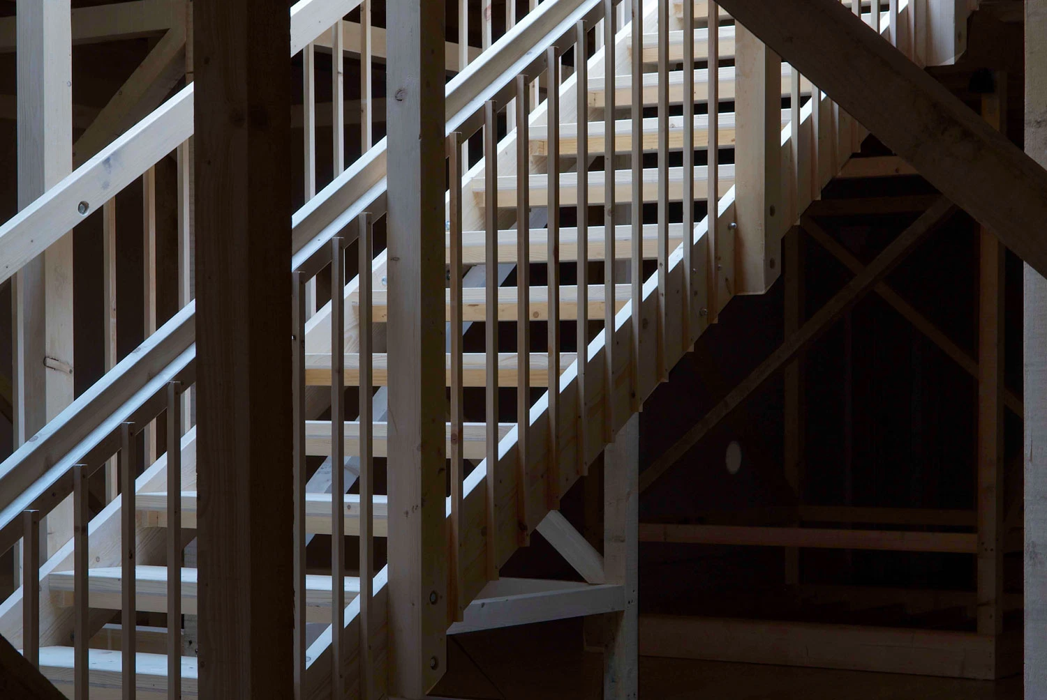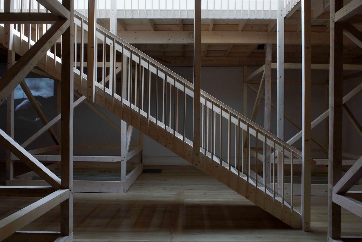 For the exhibition internationally acclaimed Brazilian artist Rivane Neuenschwander completely transformed the gallery space with a site-specific installation. Monumental in scale, yet incorporating minimalist elements including drilled holes, the residual dust and tiny perforations in every frame of a 16mm film, this major new work encompassed a number of discrete but inter-related components. Born of the artist's unique sensitivity to space, Neuenschwander's installation took as its starting point the full height of the SLG's impressive main exhibition hall, the beautiful glass ceiling lantern and the horizontal line which notionally divides the space in two. A visually elaborate but essentially simple wooden structure supported a new floor punctuated by a staircase leading visitors to the level above and an entirely fresh perspective on the upper area of the gallery. A perpetual dialogue between additive and reductive processes was established, a dialogue which permeated the exhibition, each work within it and the relationships between them. The temporary structure equally transformed the lower half of the gallery, populating it with supporting struts and obscuring the daylight which would otherwise flood the gallery. Here the floor became a ceiling, emphasising the interior nature of lower space.