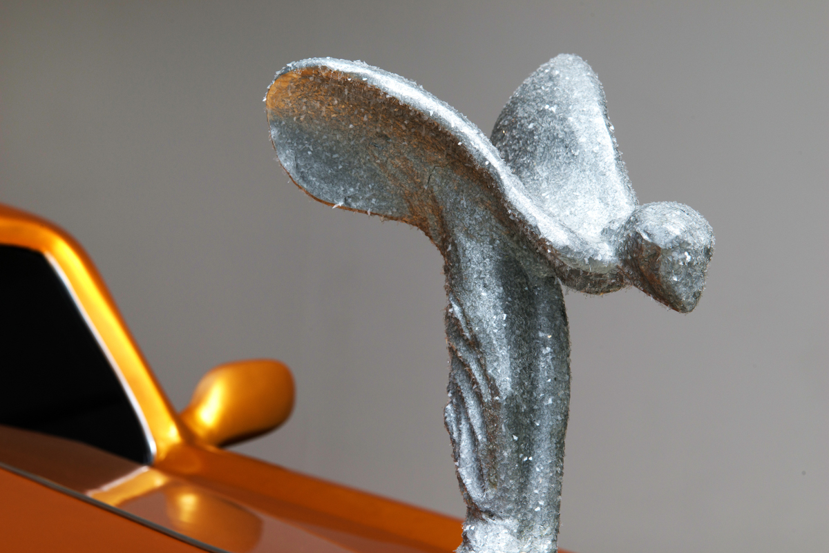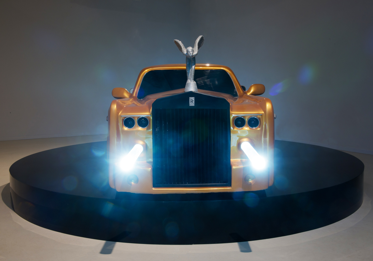 Asulin's installation – 'Ark' – was a hybrid creation merging the Ark of the Covenant and a Rolls Royce in the form of a two car fronts positioned back-to-back (similar to the car in the film 'Kompot Na'alyim' with Yehuda Barkan and Ezra Shem Tov). The Rolls Royce is the most sacred symbol of luxury cars in the world, with only a handful produced each month and all custom designed to client specifications. It is the purest mark of wealth and extravagance, an extreme show of the power of capitalism. The front of a Rolls Royce is designed to impress. For over a century now, the grille bars have been arranged by hand, appearing like the façade of a Greek temple as they support the slanted "roof", upon which stands the iconic figure of Nike, the goddess of victory. This figurine is called the 'Spirit of Ecstasy', and in this exhibition version it appeared an enlarged.