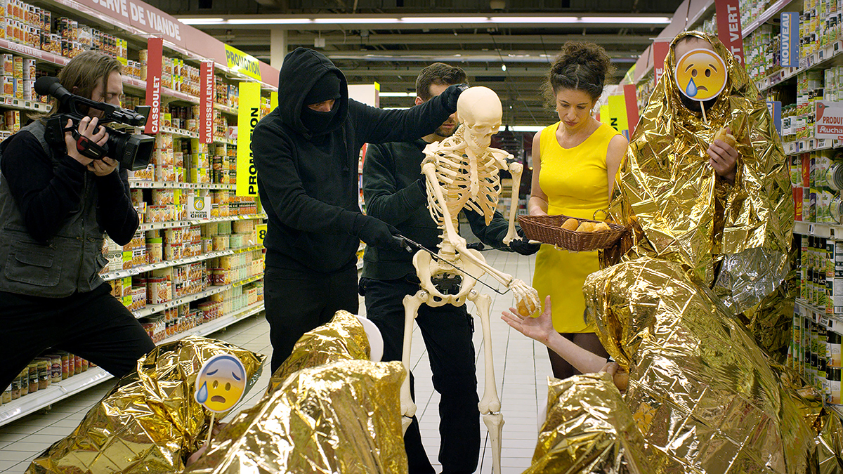 The work was screened in three sculptural environments that invited viewers to a journey through worldly, corporeal settings of a supermarket and a stalactite cave that culminate in an abysmal black space. The shift between environments in the film and the sculptural installation is linked to the perception of time in Hirschfeld's work, articulating processes of change and renewal, a metamorphosis of the image from matter to spirit, from dead to living and vice versa.