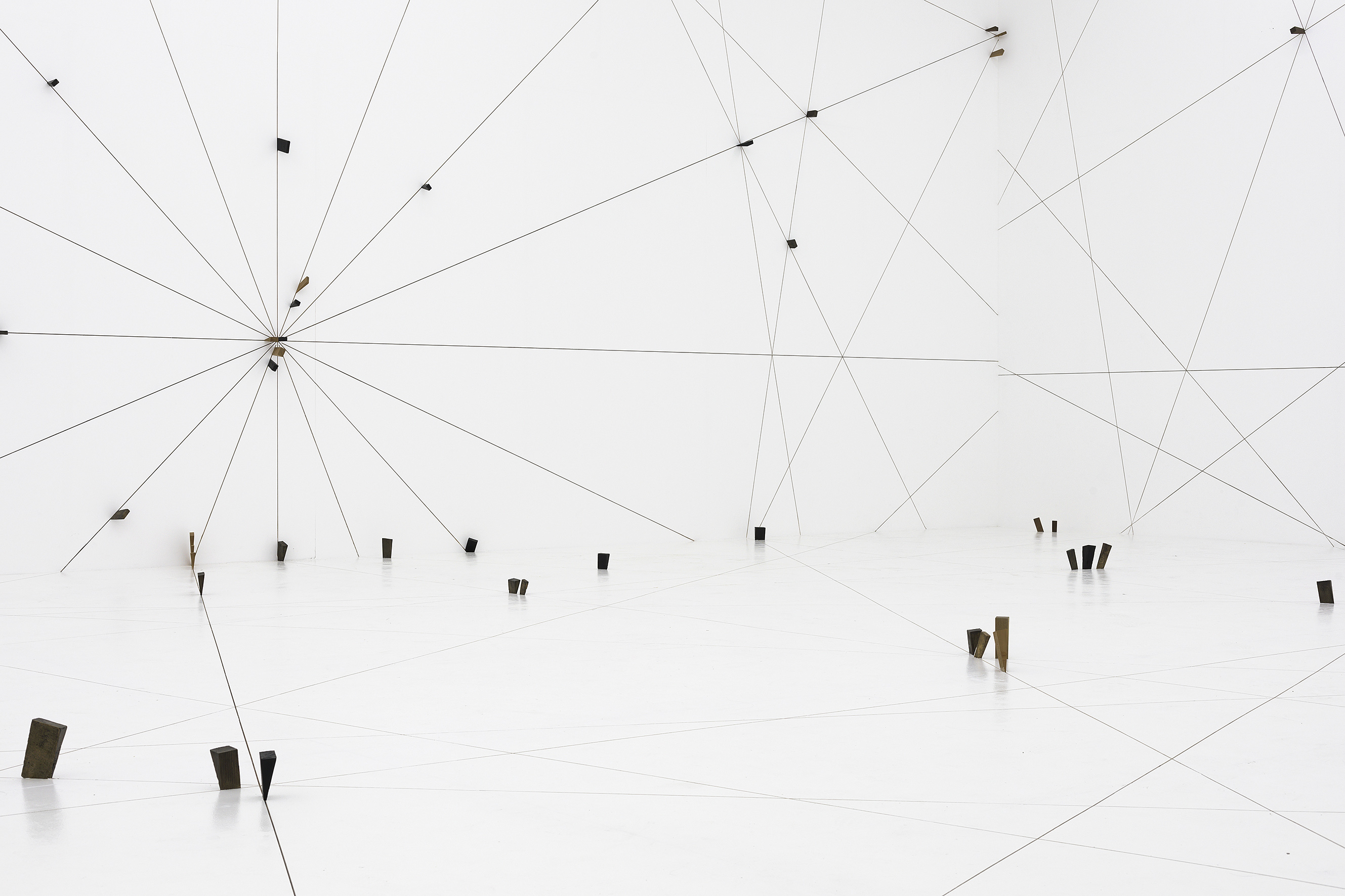 The transition to the interior space, which featured the work Prepared Space (2018), amplified the sense of immersion within the work. The action of drawing that was already identified in the temporary seems to have expanded in space, covering the entire floor and walls and totally enveloping the viewer situated within it. The entirely white space was marked by trajectories, long slits into which spacers. The various trajectories intersected and came together to form an abstract navigation map with several vanishing points, which was in fact a mathematical drawing that always includes a set number of trajectories. The spacers inserted into the work usually served to fix supporting beams prior to the casting of concrete, and were assimilated into the cast as it is made. In this work, they were stripped of their function and remained exposed to the gaze as they punctuate the space.