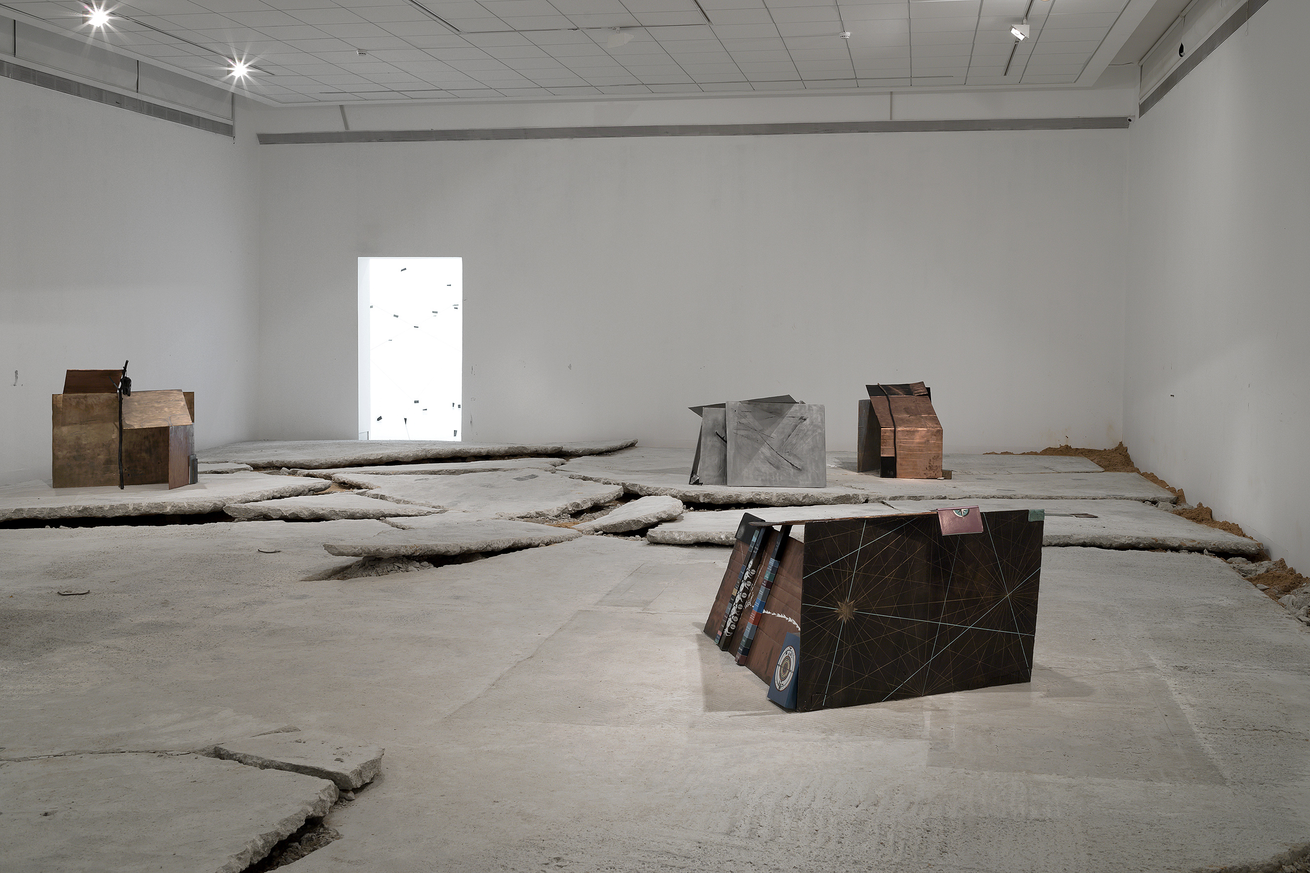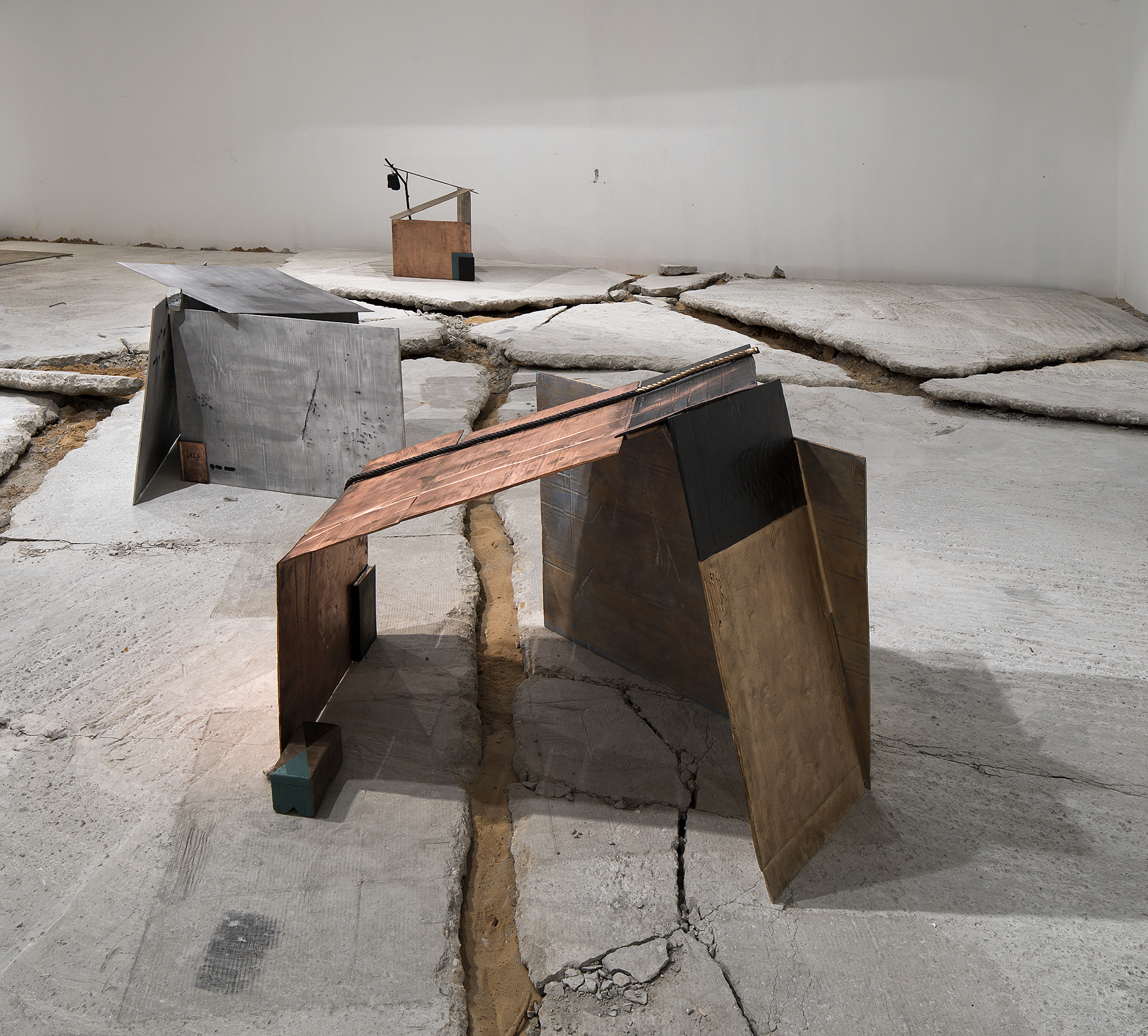 This exhibition featured two large-scale, site-specific installations by Trouvé. In the first space, the viewer came upon a cracked, broken surface on which several sculptural objects are scattered: temporary shelters of sorts cast from used sheets of cardboard in bronze, aluminium, and copper. Affixed to the sides of these structures were old diaries, various objects, and additional material elements. On some of these surfaces, Trouvé imprinted maps and signs that refer to a wide range of time periods and cultures.