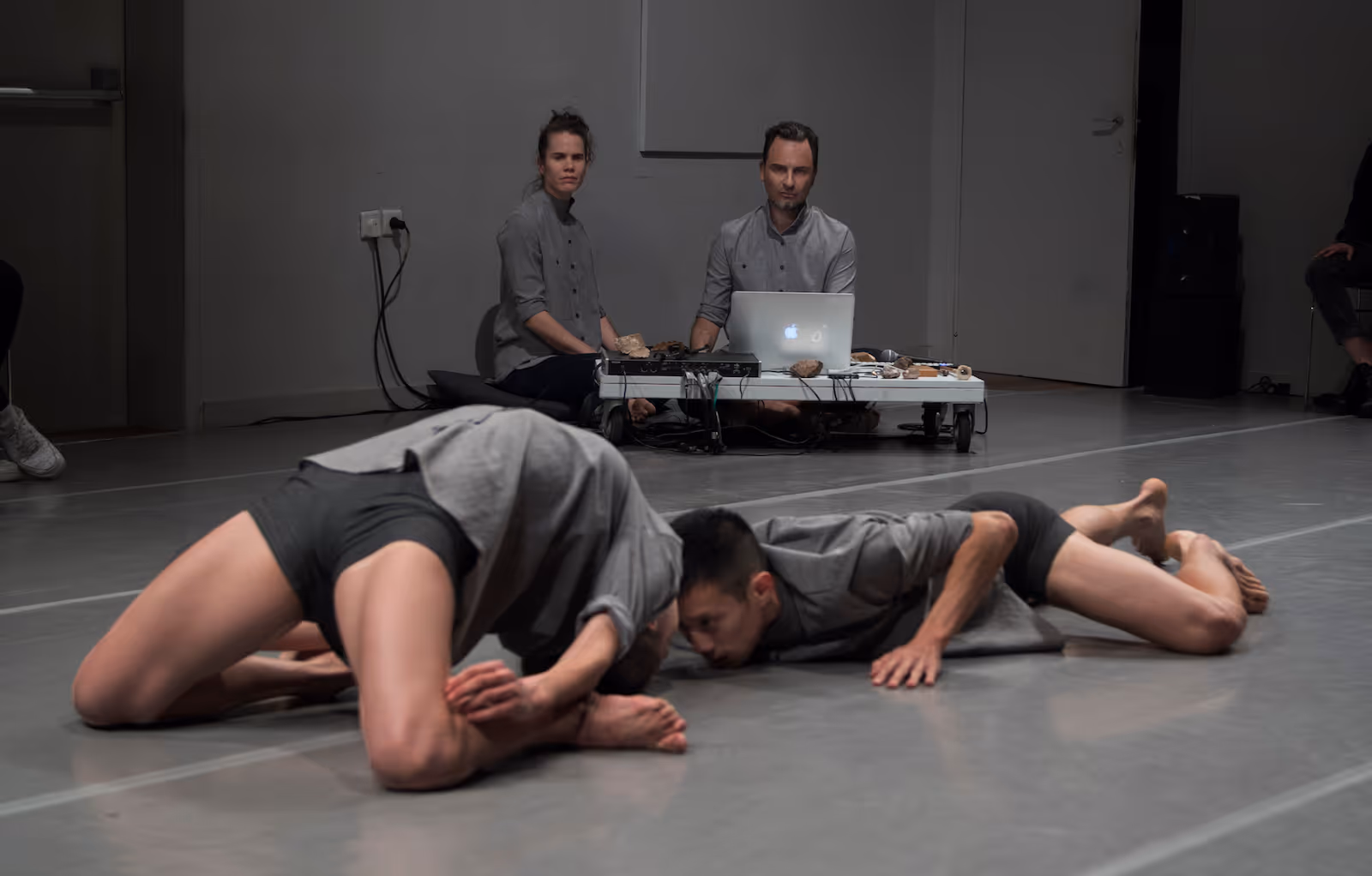 Noa Zuk and Ohad Fishof create dance works with an affinity for the absurd that occasionally masquerade as exotic fantasy. At the heart of their collaborative practice lies the complex interaction between the visible and auditory - both in dance and in general - whose approach is informed by a wide variety of mediums including cinema, sound art, ballet, pop music, and folkloric practices. They often integrate parallel algorithms in sound and in movement, usually accompanied by both live and recorded sound. Alongside an aesthetic vision founded upon the research of human movement, both in their stage-based works and in their videos, Zuk and Fishof often employ invented languages, dance structures inspired by ethnographic fiction, and the capacity of employing narrative as an image. 'The Burnt Room' was designed for an audience positioned around two dancers within a unique musical setting.