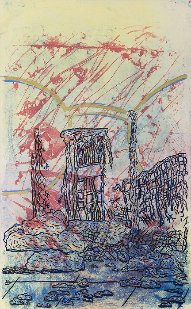 Shield’s works explore unreconciled pictorial planes through layers of texture and figuration, using pliable media such as ink, oil bar, paint and monoprint. Transparent sheets are overlaid to compress and create the impression of a view into a dream sequence. The use of multiple panels employed in Expo Dream Leech responds to the scale of the space in Outset Study and reference Shield’s long-standing fascination with publication and comic book layout. In addition, the use of poster-print repetition of billboard imagery functions as a device to both sequence a series of images and create one whole image simultaneously.