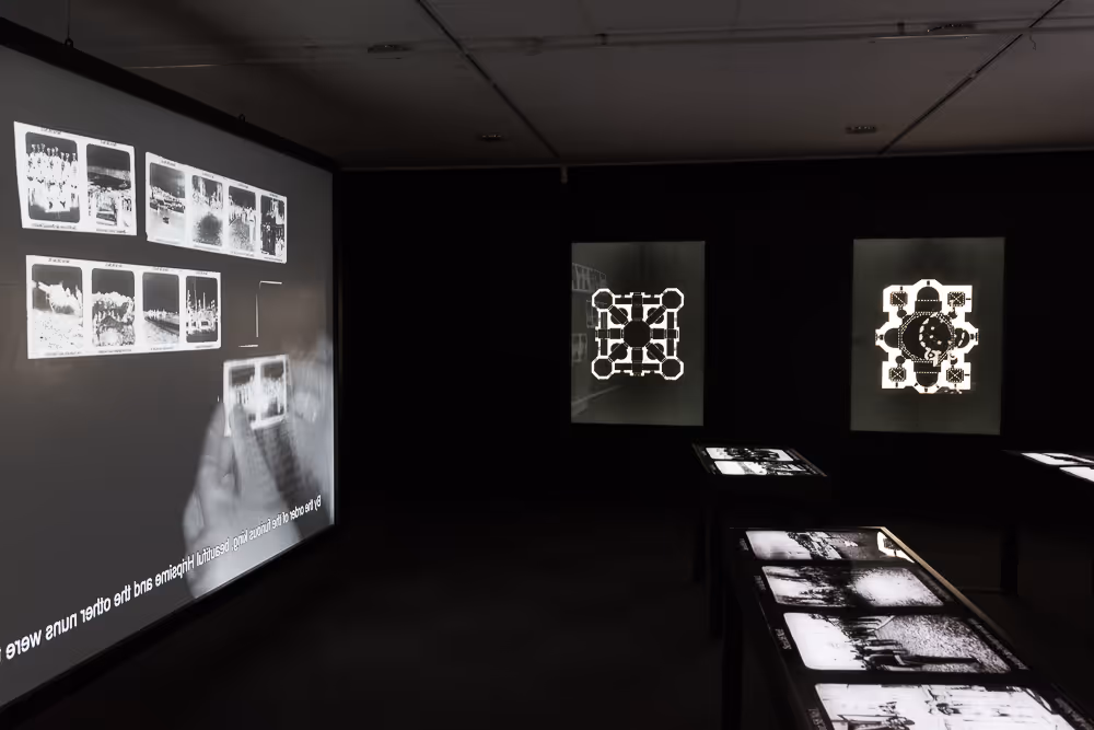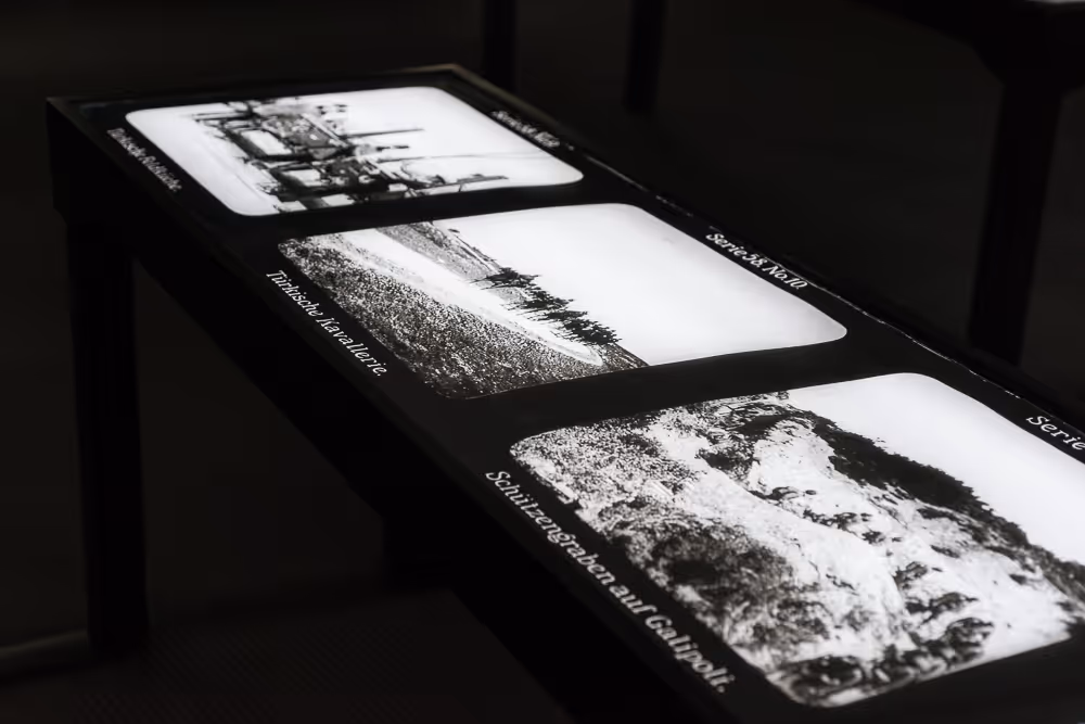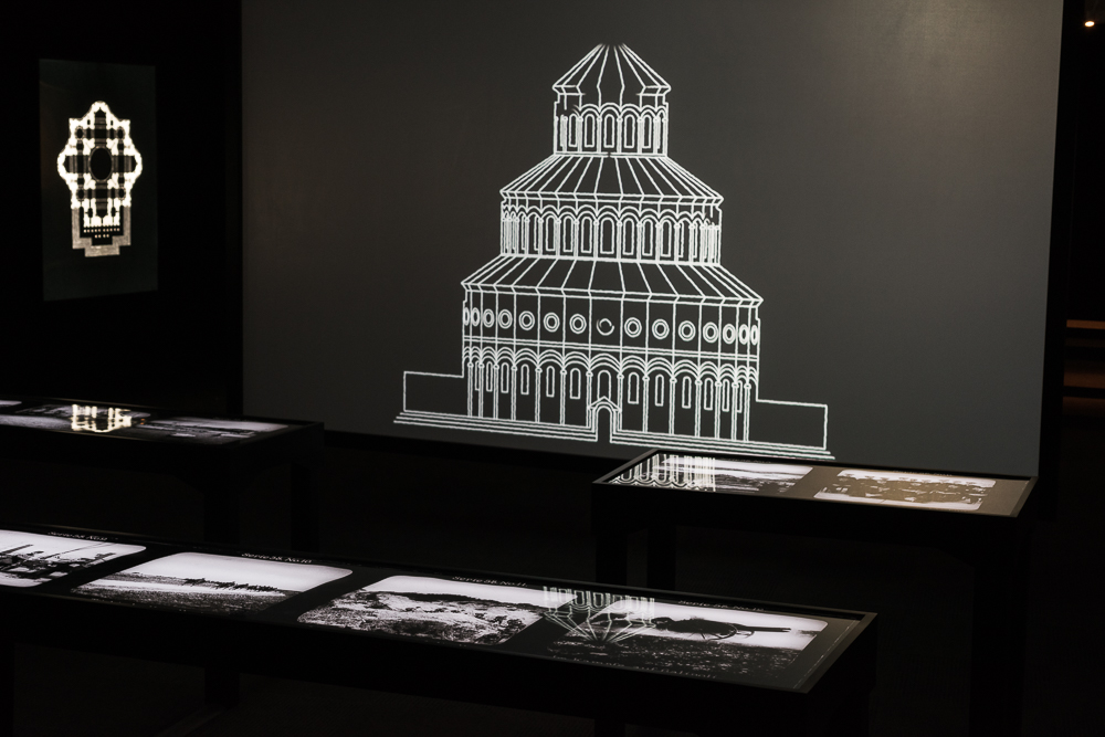 Pointing to a link between his compositional work and Armenia’s landscapes, the composer is set on completing his Armenian musical pieces only after visiting Armenia. On their way to the holy places, an archival radio conversation between Komitas and Suni, two well-known early twentieth century Armenian composers, is heard in the background. The two compare composing to a journey and point to a connection between the art of musical composition the landscape of Armenia. The video work is enclosed on both sides by a series of light boxes. The light box images seemed at first glance as ornaments taken from the painted tiles shown at the entrance to the exhibition, but a closer look revealed that these are reproductions of ground plans of Armenian churches with their characteristic differing exteriors and interiors. The exhibition closed with a series of vitrines containing prints reproduced from glass slides, showing images that have appeared as negatives in the video work. The glass slides documenting the Ottoman Army during World War I were made as learning aids in Europe. Among them, was one showing Enver Pasha, the Ottoman Minister of War, one of the principal perpetrators of the Armenian Genocide.