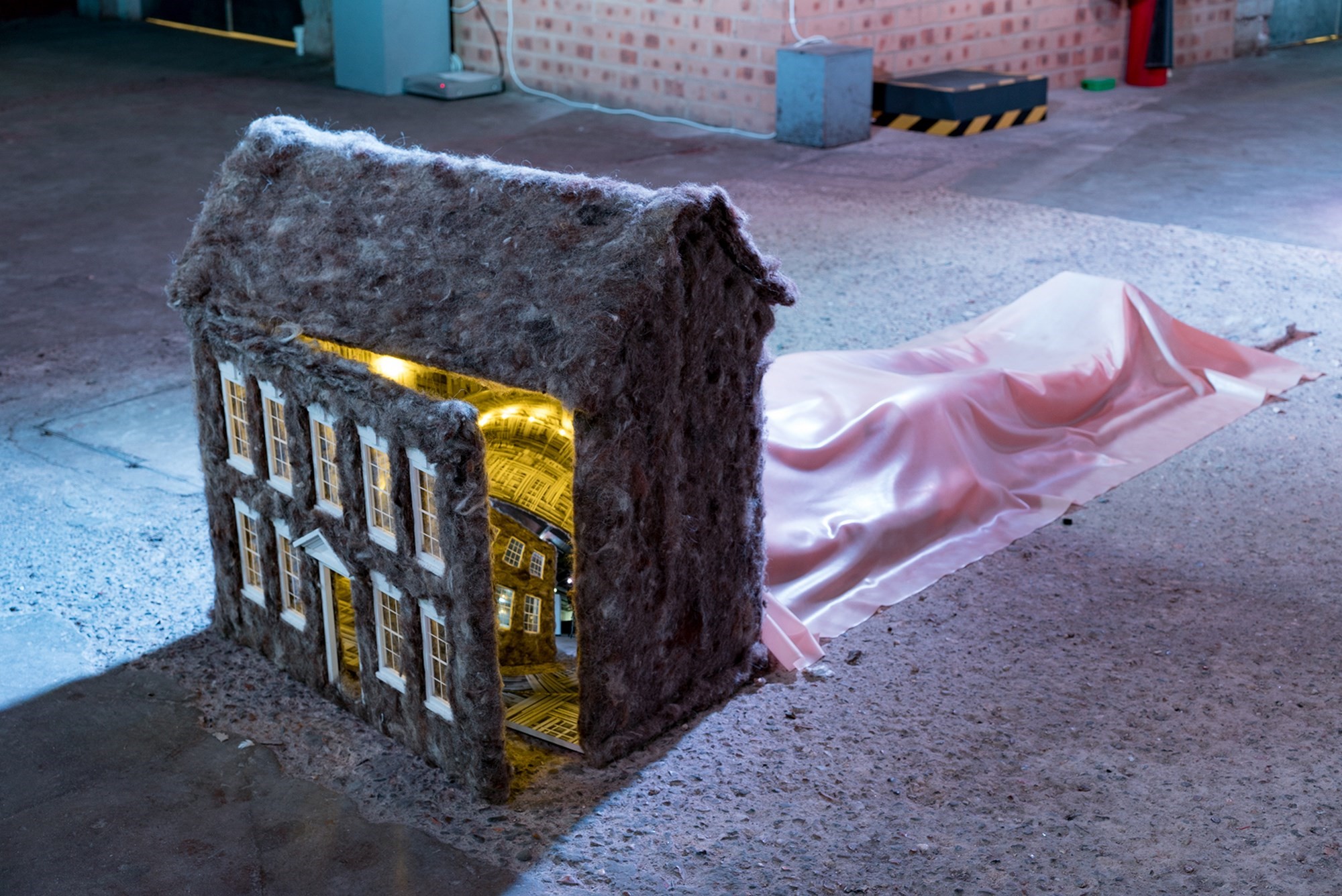 Beside the ephemera of Blackstock’s performance lay a body sheathed in pink latex, its head concealed within the illuminated maquette of a house. The body belonged to artist Simona Sharafudinov, whose workHaus of Perestroikaasks the viewer to reimagine the cities of tomorrow by confronting their fear of homelessness. This work was first performed in 2016 for 30 hours over a period of five days at an exhibition in Hackney, London. "My interest lies in questioning the process of image-making in relation to exiled identity and idealised systems of value," says Sharafudinov.