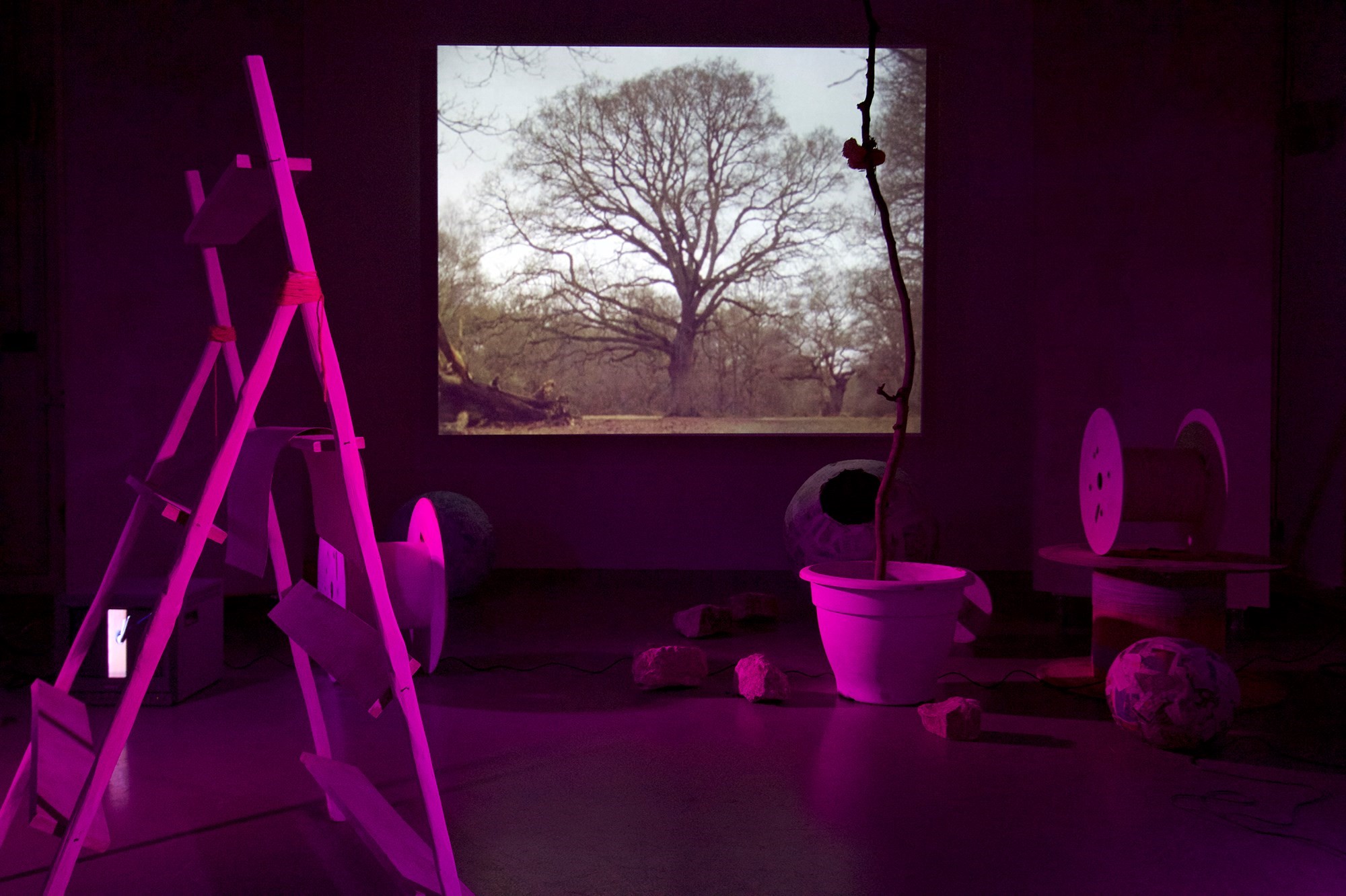 Natalie Kynigopoulou, a graduate of The Slade, showed an installation piece that incorporated sculpture, video and sound. An oversized spool of pink cotton lay beside a potato on a plinth, a planted tree and a small garden shed. Projected on the back wall was a video of various natural phenomena. "I work between photography, objects, more recently early animation and 16mm film," the artist says of her practice. "Sound has recently also become particularly important."