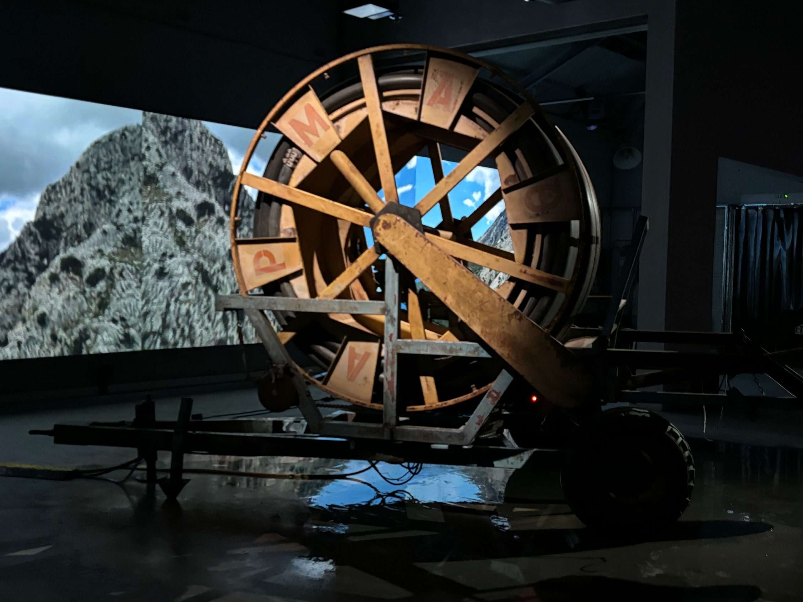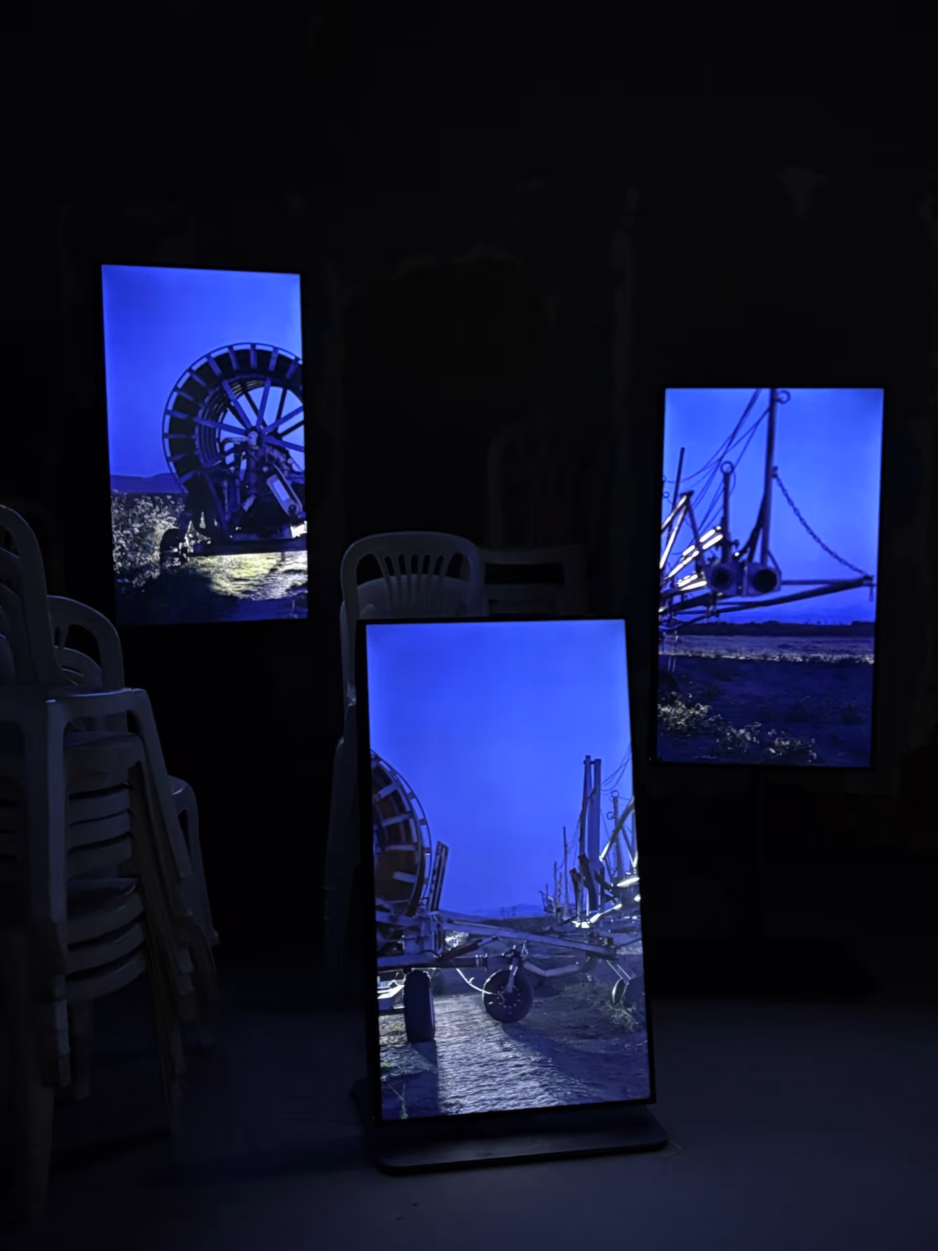 The artists behind the work refer to water as a prism —a way of seeing and thinking—focusing on its scarcity or abundance, on how it is needed or wasted, as well as on its social connotations. The exhaustion of resources is linked here to physical and financial exhaustion. The work navigates the political potential of sound and music, and the impact of technology on rural landscapes and cultural diversity.